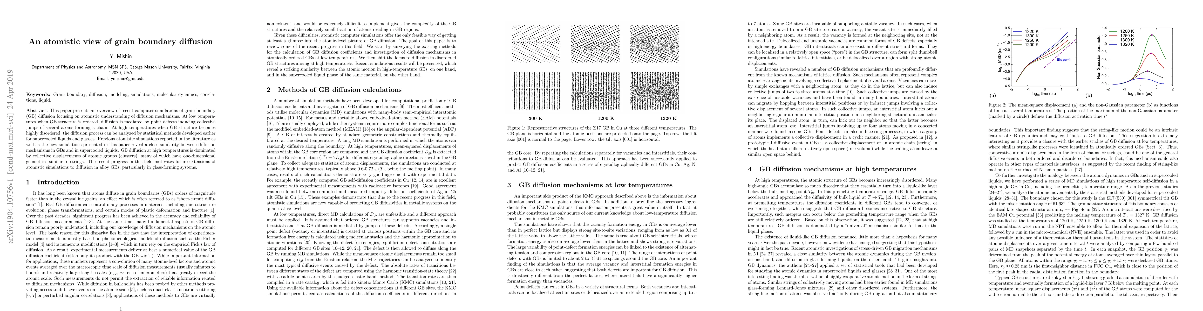 This paper reviews recent simulations of grain boundary diffusion, revealing that at low temperatures diffusion is driven by point defects and collective atomic jumps, while at high temperatures it resembles diffusion in supercooled liquids, dominated by one-dimensional cluster displacements. Future research should extend these simulations to diffusion in alloy grain boundaries, especially in glass-forming systems.