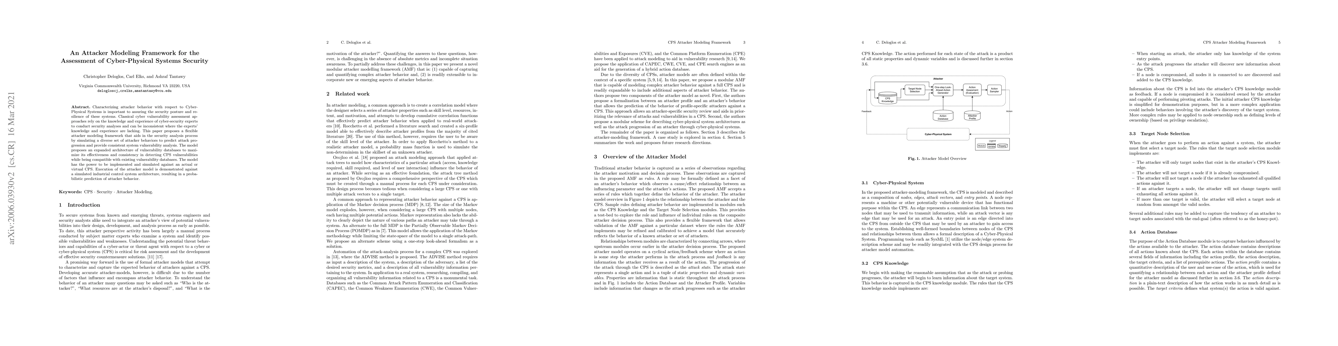Characterizing attacker behavior with respect to Cyber-Physical Systems is important to assuring the security posture and resilience of these systems. Classical cyber vulnerability assessment approaches rely on the knowledge and experience of cyber-security experts to conduct security analyses and can be inconsistent where the experts' knowledge and experience are lacking. This paper proposes a flexible attacker modeling framework that aids in the security analysis process by simulating a diverse set of attacker behaviors to predict attack progression and provide consistent system vulnerability analysis. The model proposes an expanded architecture of vulnerability databases to maximize its effectiveness and consistency in detecting CPS vulnerabilities while being compatible with existing vulnerability databases. The model has the power to be implemented and simulated against an actual or virtual CPS. Execution of the attacker model is demonstrated against a simulated industrial control system architecture, resulting in a probabilistic prediction of attacker behavior.