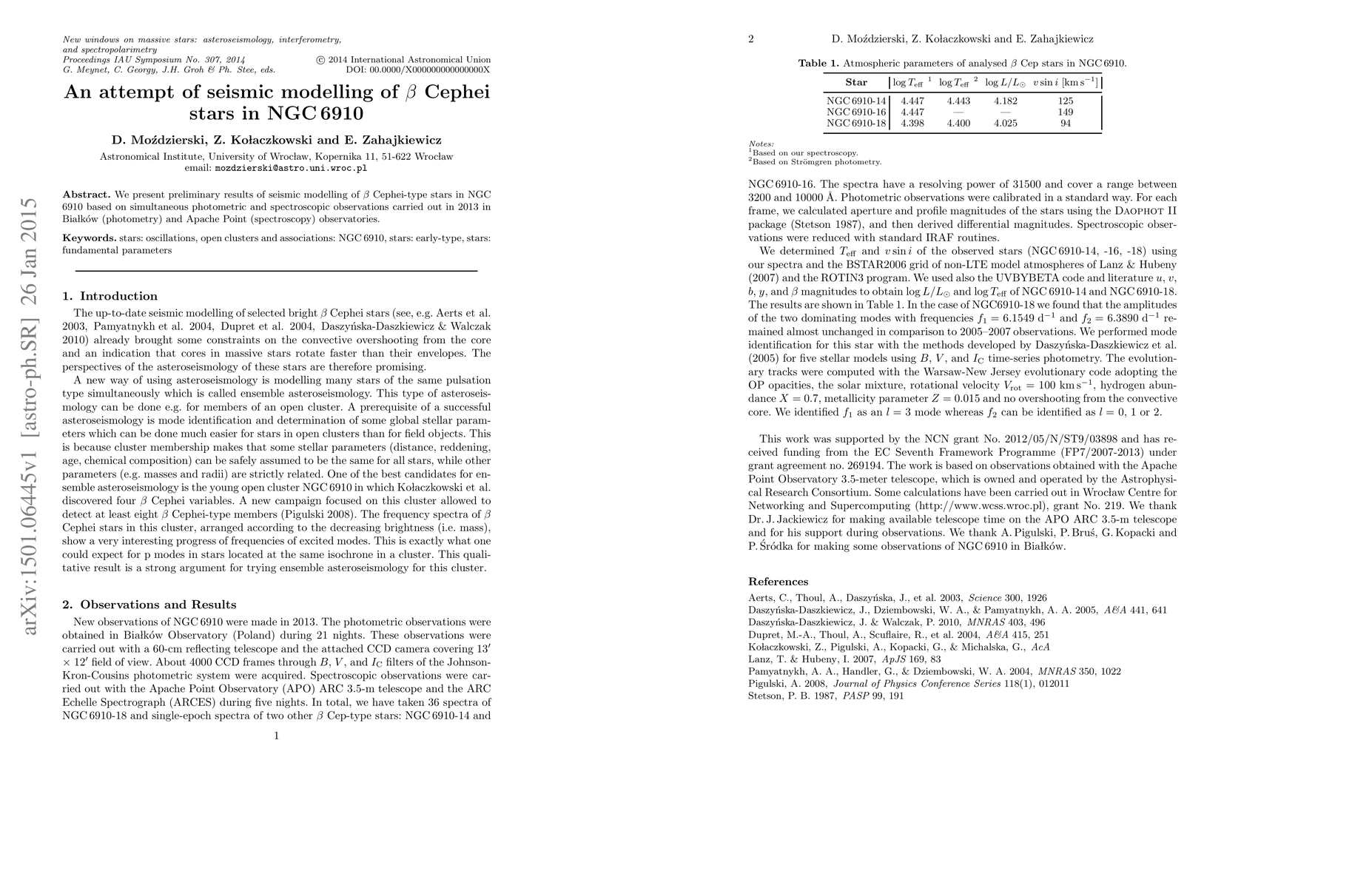 We present preliminary results of seismic modeling of Beta Cephei-type stars in NGC 6910 based on simultaneous photometric and spectroscopic observations carried out in 2013 in Bialkow (photometry) and Apache Point (spectroscopy) observatories.