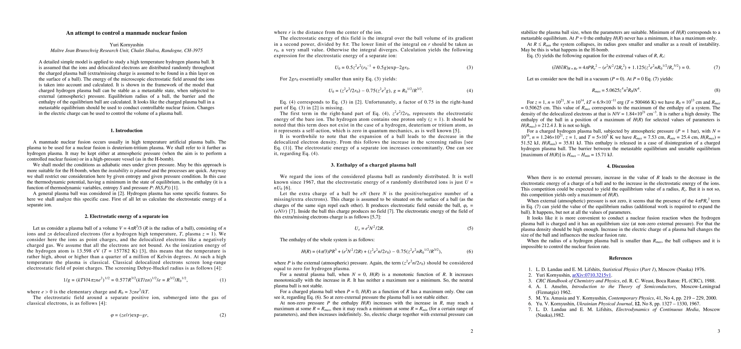 A detailed simple model is applied to study a high temperature hydrogen plasma ball. It is assumed that the ions and delocalized electrons are distributed randomly throughout the charged plasma ball (extra/missing charge is assumed to be found in a thin layer on the surface of a ball). The energy of the microscopic electrostatic field around the ions is taken into account and calculated. It is shown in the framework of the model that charged hydrogen plasma ball can be stable as a metastable state, when subjected to external (atmospheric) pressure. Equilibrium radius of a ball, the barrier and the enthalpy of the equilibrium ball are calculated. It looks like the charged plasma ball in a metastable equilibrium should be used to conduct controllable nuclear fusion. Changes in the electric charge can be used to control the volume of a plasma ball.