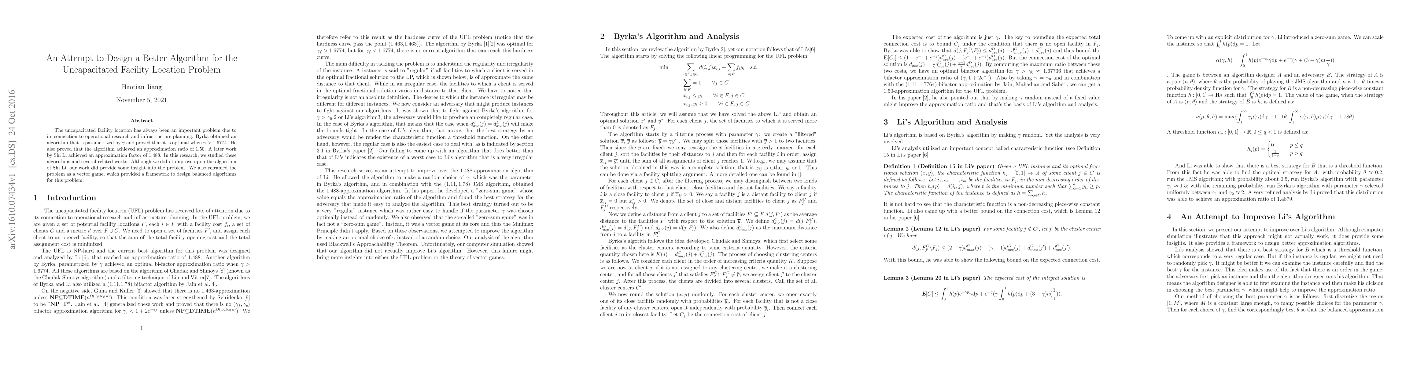 The uncapacitated facility location has always been an important problem due to its connection to operational research and infrastructure planning. Byrka obtained an algorithm that is parametrized by $\gamma$ and proved that it is optimal when $\gamma>1.6774$. He also proved that the algorithm achieved an approximation ratio of 1.50. A later work by Shi Li achieved an approximation factor of 1.488. In this research, we studied these algorithms and several related works. Although we didn't improve upon the algorithm of Shi Li, our work did provide some insight into the problem. We also reframed the problem as a vector game, which provided a framework to design balanced algorithms for this problem.