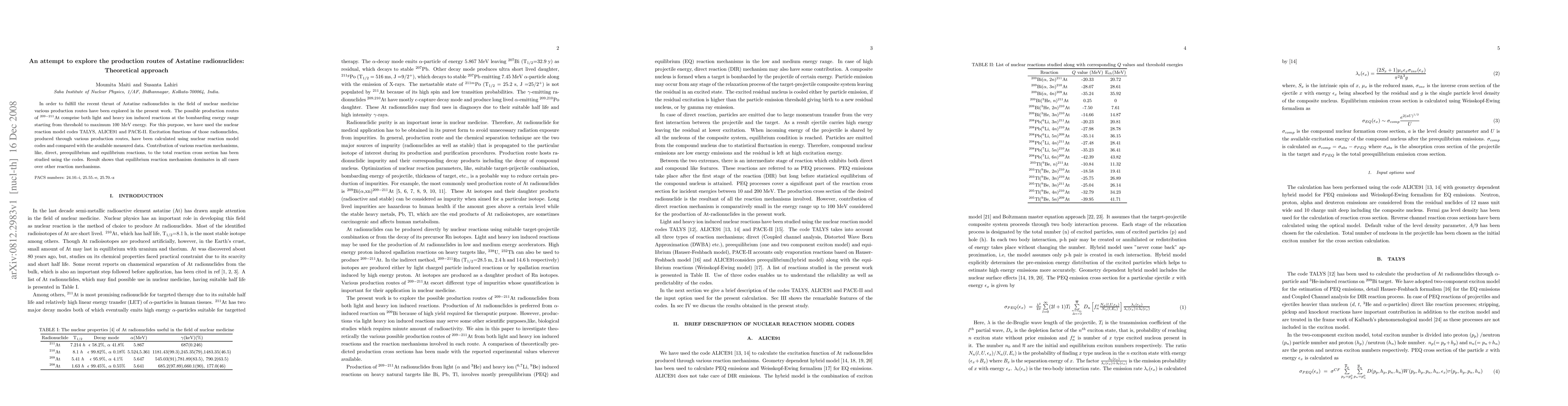 In order to fulfil the recent thrust of Astatine radionuclides in the field of nuclear medicine various production routes have been explored in the present work. The possible production routes of $^{209-211}$At comprise both light and heavy ion induced reactions at the bombarding energy range starting from threshold to maximum 100 MeV energy. For this purpose, we have used the nuclear reaction model codes TALYS, ALICE91 and PACE-II. Excitation functions of those radionuclides, produced through various production routes, have been calculated using nuclear reaction model codes and compared with the available measured data. Contribution of various reaction mechanisms, like, direct, preequilibrium and equilibrium reactions, to the total reaction cross section has been studied using the codes. Result shows that equilibrium reaction mechanism dominates in all cases over other reaction mechanisms.