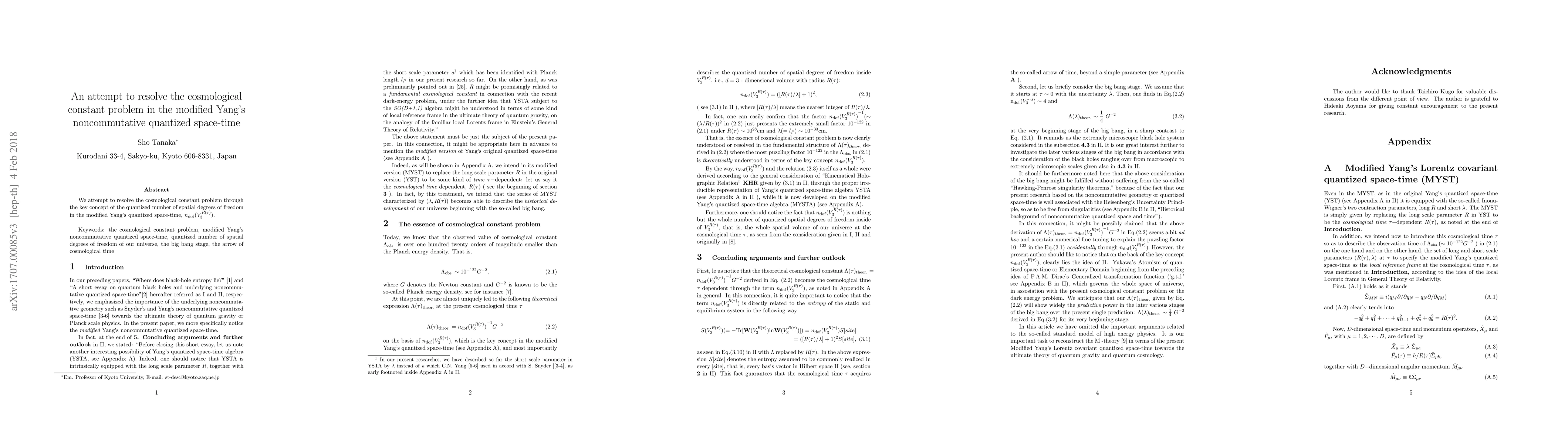 We attempt to resolve the cosmological constant problem through the key concept of the quantized number of spatial degrees of freedom in the modified Yang's quantized space-time, $n_{\rm {dof}} (V_3^{R(\tau)})$.