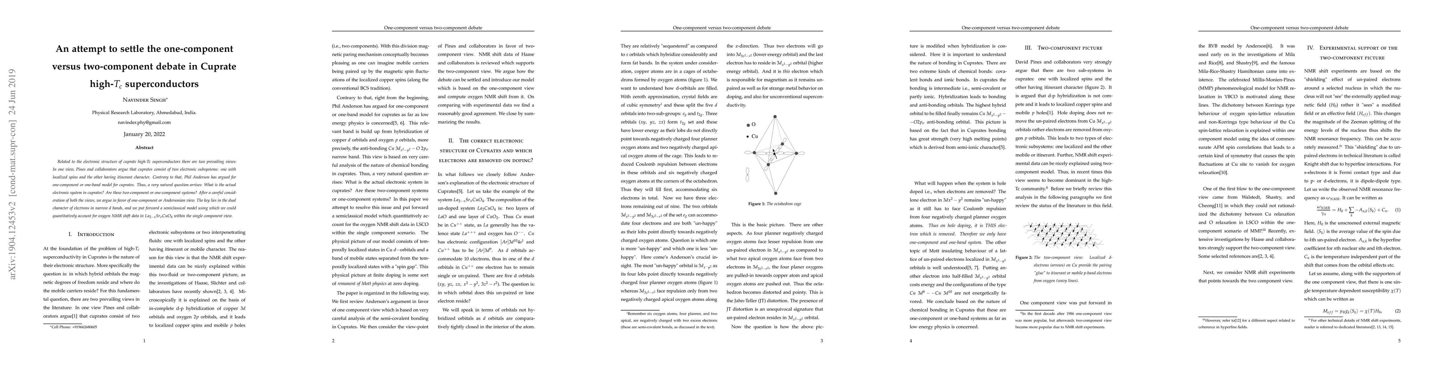 This paper debates the electronic structure of cuprate high-$T_c$ superconductors, favoring the one-component model proposed by Phil Anderson over the two-component view of Pines. It uses a semiclassical model to quantitatively explain oxygen NMR shift data in $La_{2-x}Sr_xCuO_4$ within the single-component framework.