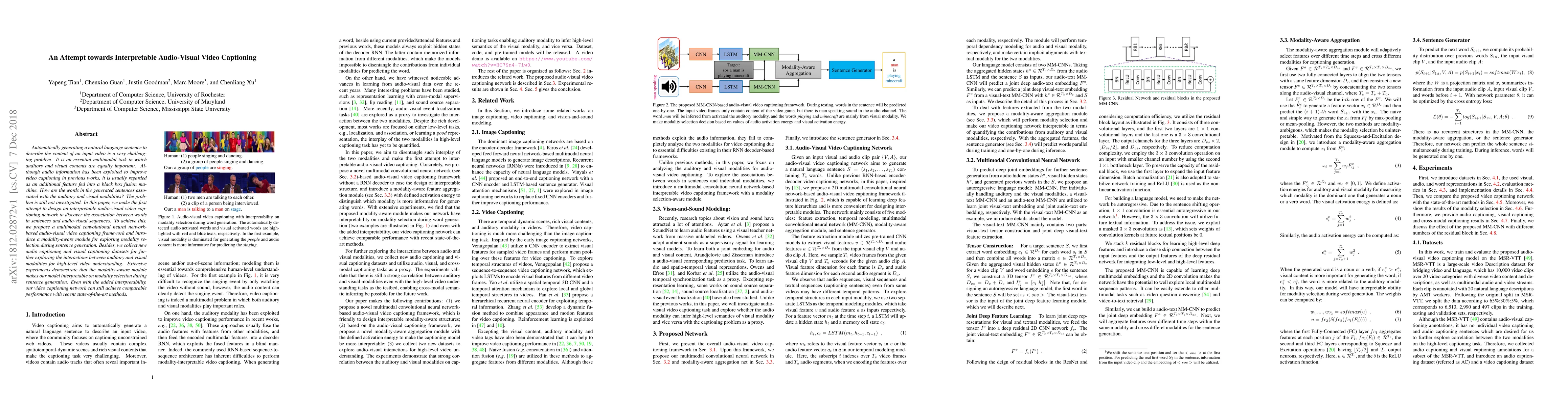 This paper proposes an interpretable audio-visual video captioning network to explore the association between words and audio-visual modalities, introducing a modality-aware module for modality selection. Despite enhanced interpretability, the model achieves comparable performance to state-of-the-art methods.