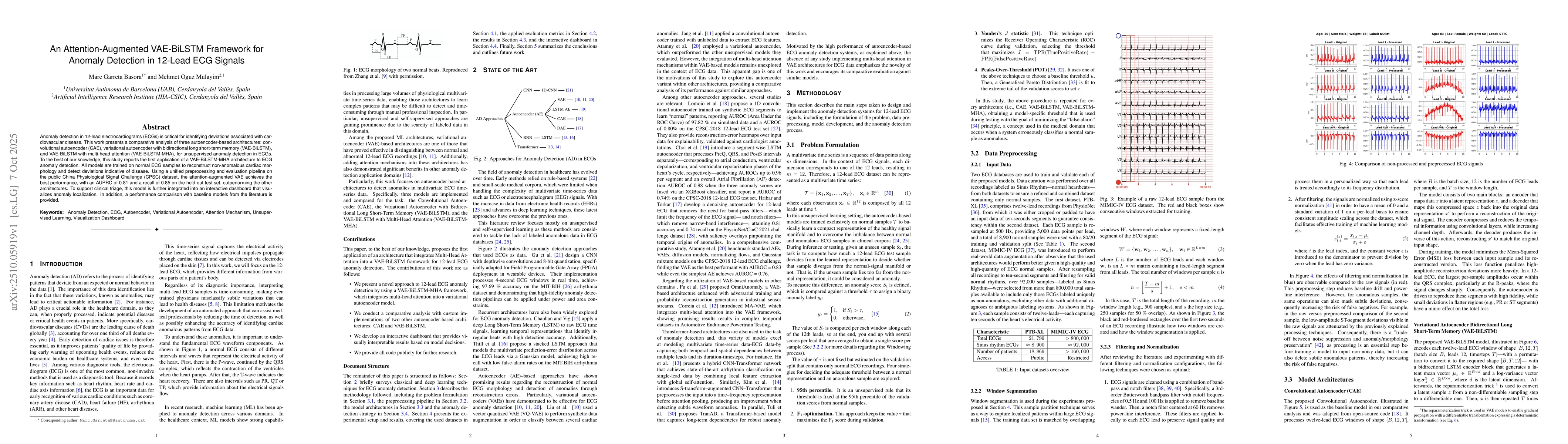 Anomaly detection in 12-lead electrocardiograms (ECGs) is critical for identifying deviations associated with cardiovascular disease. This work presents a comparative analysis of three autoencoder-based architectures: convolutional autoencoder (CAE), variational autoencoder with bidirectional long short-term memory (VAE-BiLSTM), and VAE-BiLSTM with multi-head attention (VAE-BiLSTM-MHA), for unsupervised anomaly detection in ECGs. To the best of our knowledge, this study reports the first application of a VAE-BiLSTM-MHA architecture to ECG anomaly detection. All models are trained on normal ECG samples to reconstruct non-anomalous cardiac morphology and detect deviations indicative of disease. Using a unified preprocessing and evaluation pipeline on the public China Physiological Signal Challenge (CPSC) dataset, the attention-augmented VAE achieves the best performance, with an AUPRC of 0.81 and a recall of 0.85 on the held-out test set, outperforming the other architectures. To support clinical triage, this model is further integrated into an interactive dashboard that visualizes anomaly localization. In addition, a performance comparison with baseline models from the literature is provided.