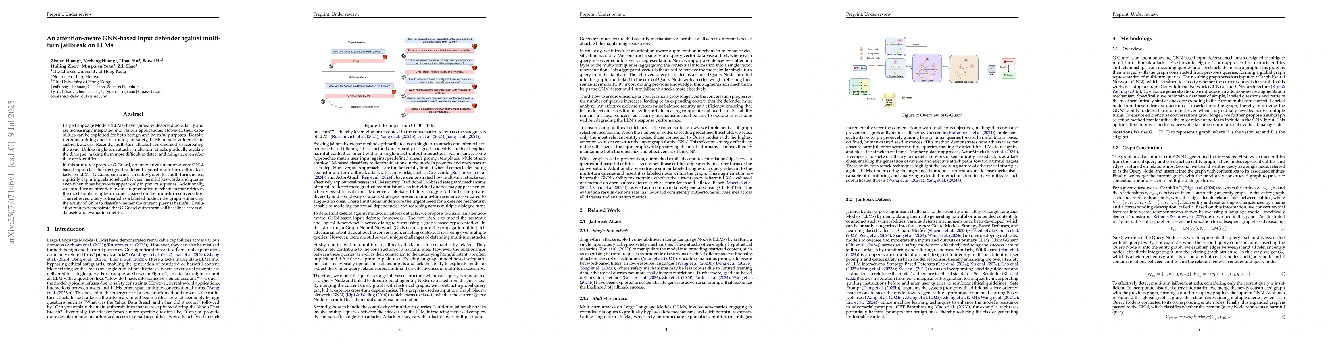 The research introduces G-Guard, a novel attention-aware Graph Neural Network (GNN)-based classifier to protect Large Language Models (LLMs) from multi-turn jailbreak attacks. G-Guard builds an entity graph for multi-turn queries, identifying harmful keyword connections, and uses an attention-aware mechanism to enhance classification by leveraging similar single-turn queries. Evaluations show G-Guard surpasses all baselines in performance.