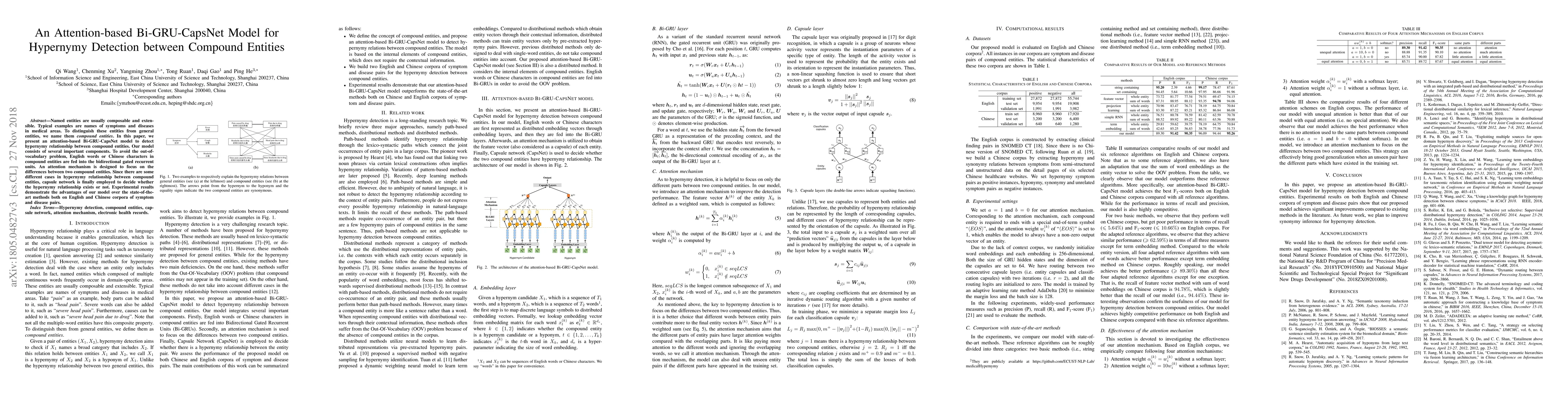 This paper proposes an attention-based model to detect hypernymy relationships between compound entities, such as medical symptoms and diseases, using a Bi-GRU-CapsNet architecture.