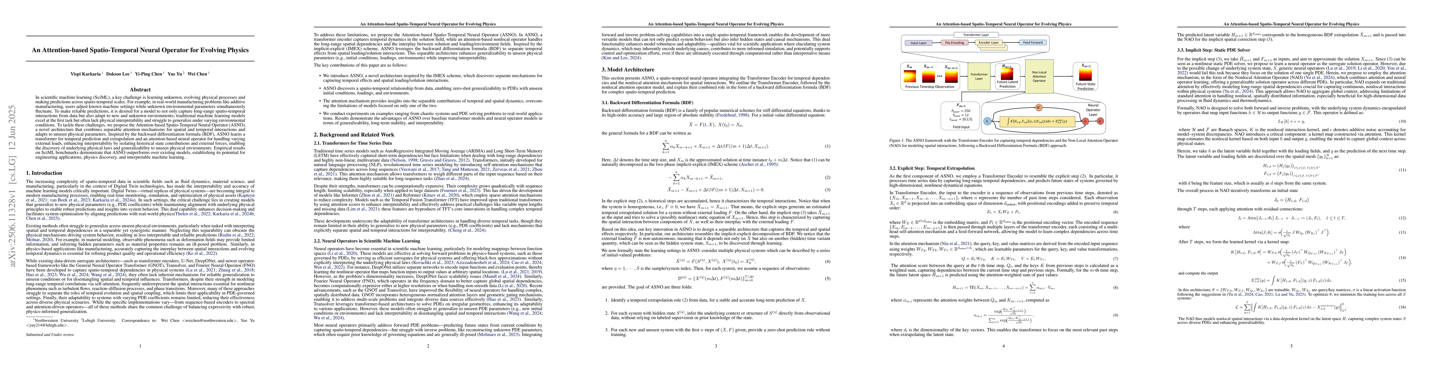 In scientific machine learning (SciML), a key challenge is learning unknown, evolving physical processes and making predictions across spatio-temporal scales. For example, in real-world manufacturing problems like additive manufacturing, users adjust known machine settings while unknown environmental parameters simultaneously fluctuate. To make reliable predictions, it is desired for a model to not only capture long-range spatio-temporal interactions from data but also adapt to new and unknown environments; traditional machine learning models excel at the first task but often lack physical interpretability and struggle to generalize under varying environmental conditions. To tackle these challenges, we propose the Attention-based Spatio-Temporal Neural Operator (ASNO), a novel architecture that combines separable attention mechanisms for spatial and temporal interactions and adapts to unseen physical parameters. Inspired by the backward differentiation formula (BDF), ASNO learns a transformer for temporal prediction and extrapolation and an attention-based neural operator for handling varying external loads, enhancing interpretability by isolating historical state contributions and external forces, enabling the discovery of underlying physical laws and generalizability to unseen physical environments. Empirical results on SciML benchmarks demonstrate that ASNO outperforms over existing models, establishing its potential for engineering applications, physics discovery, and interpretable machine learning.