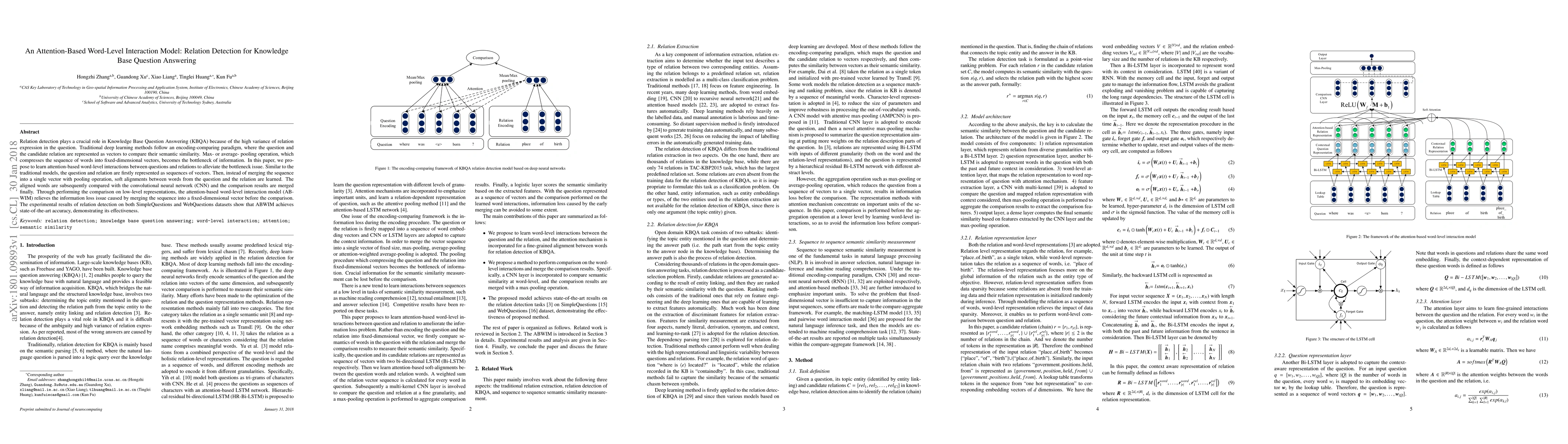 This paper proposes an attention-based word-level interaction model (ABWIM) for relation detection in Knowledge Base Question Answering (KBQA). Unlike traditional methods, ABWIM learns soft alignments between words in questions and relations instead of using pooling to compress sequences, thus alleviating information loss and achieving state-of-the-art accuracy on relation detection tasks.