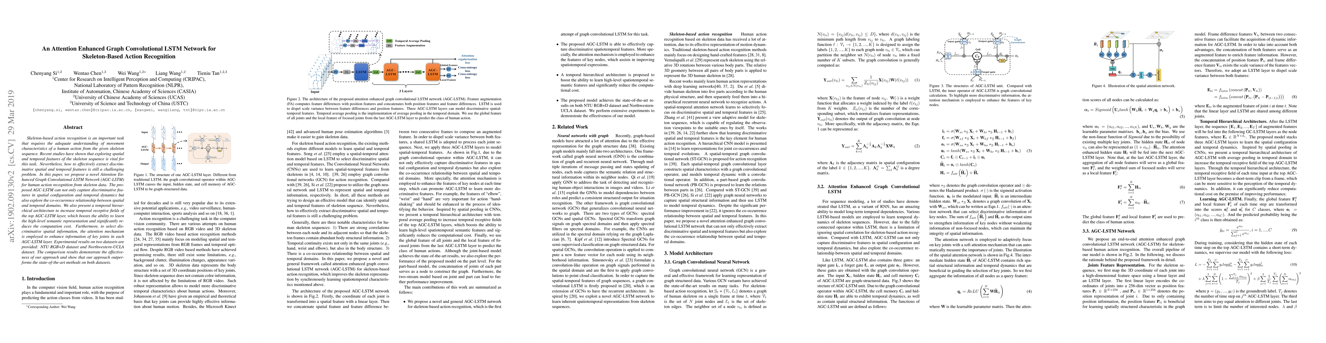 This paper proposes an Attention Enhanced Graph Convolutional LSTM Network (AGC-LSTM) for skeleton-based action recognition, combining spatial and temporal feature extraction to enhance discriminative feature learning, with an attention mechanism to focus on key joints, and a temporal hierarchical architecture to improve efficiency. Experimental results on two datasets show superior performance compared to state-of-the-art methods.