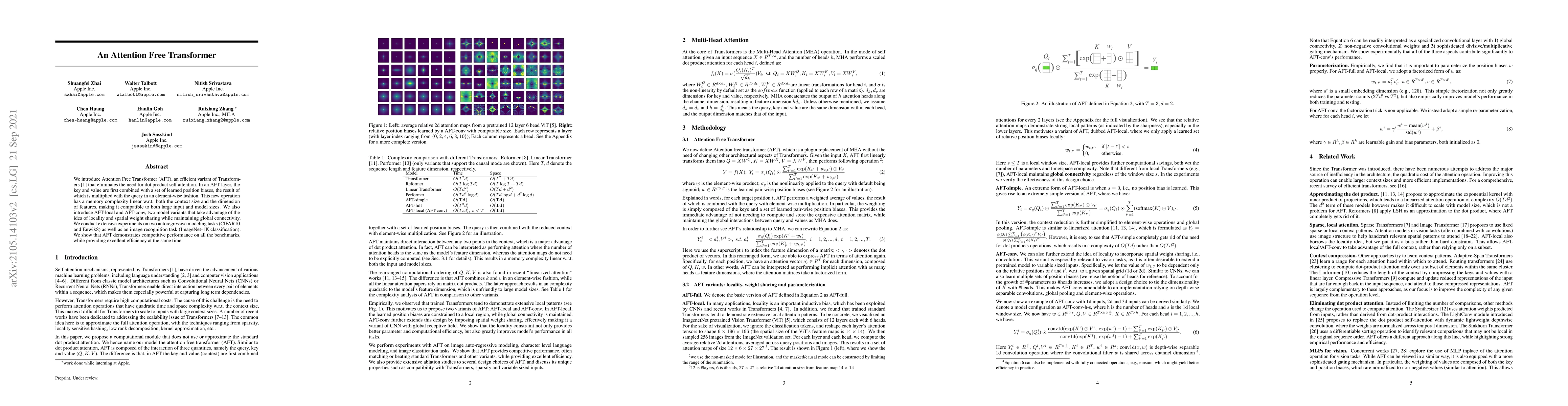 We introduce Attention Free Transformer (AFT), an efficient variant of Transformers that eliminates the need for dot product self attention. In an AFT layer, the key and value are first combined with a set of learned position biases, the result of which is multiplied with the query in an element-wise fashion. This new operation has a memory complexity linear w.r.t. both the context size and the dimension of features, making it compatible to both large input and model sizes. We also introduce AFT-local and AFT-conv, two model variants that take advantage of the idea of locality and spatial weight sharing while maintaining global connectivity. We conduct extensive experiments on two autoregressive modeling tasks (CIFAR10 and Enwik8) as well as an image recognition task (ImageNet-1K classification). We show that AFT demonstrates competitive performance on all the benchmarks, while providing excellent efficiency at the same time.