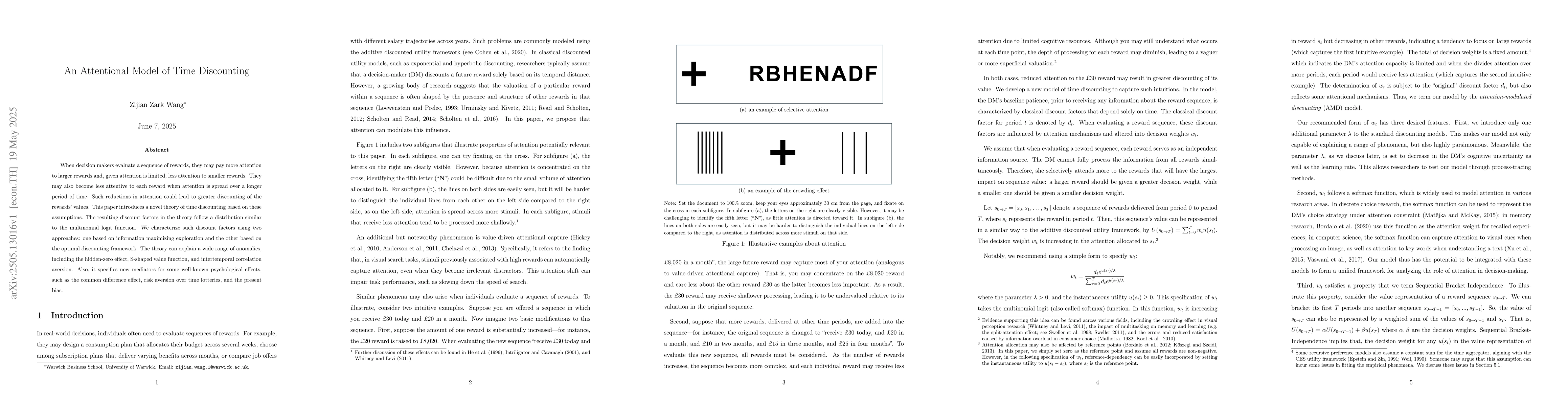 This research is important as it provides a comprehensive attentional model for time discounting, potentially enhancing our understanding of decision-making processes under uncertainty, with applications in economics, psychology, and behavioral finance.