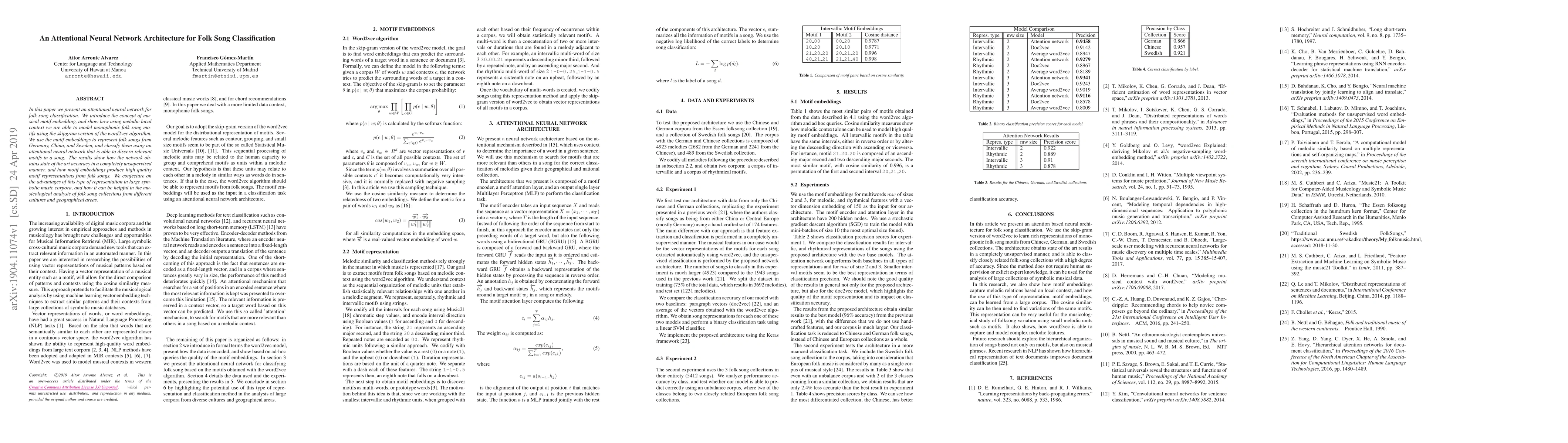 This paper introduces an attentional neural network for folk song classification that employs musical motif embedding and the skipgram algorithm to model monophonic folk song motifs. The network achieves state-of-the-art accuracy in an unsupervised manner, demonstrating the potential of motif embeddings for large symbolic music corpora and cross-cultural musicological analysis.