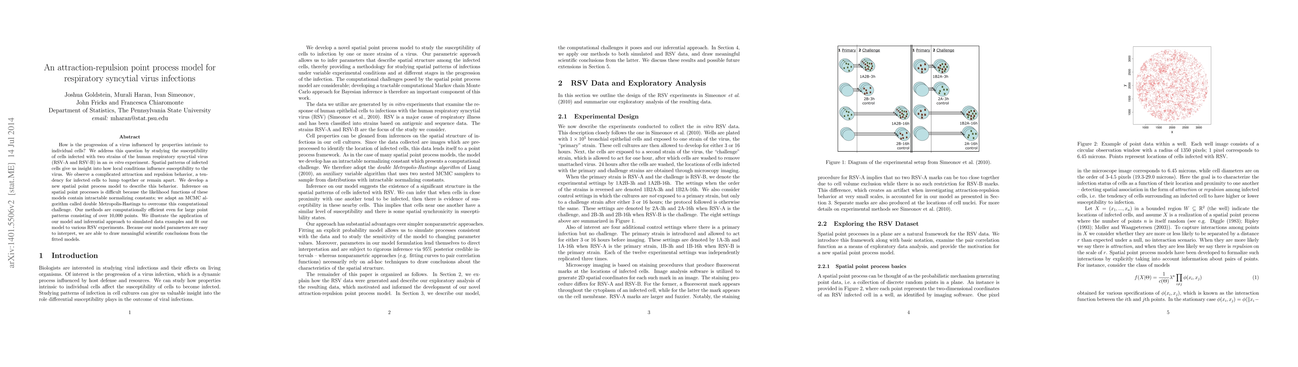 This paper develops a novel attraction-repulsion point process model to study the spatial patterns of respiratory syncytial virus (RSV) infections in vitro, revealing complex behaviors of infected cells. The authors use an efficient MCMC algorithm to handle computational challenges and apply their model to both simulated and experimental data, drawing meaningful conclusions from the results.