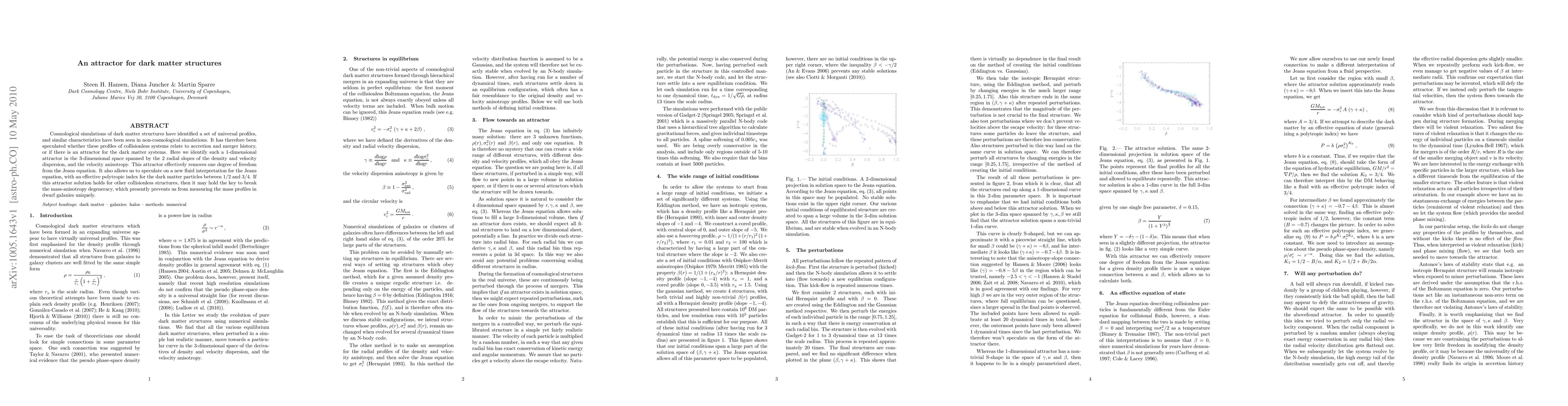 Cosmological simulations of dark matter structures have identified a set of universal profiles, and similar characteristics have been seen in non-cosmological simulations. It has therefore been speculated whether these profiles of collisionless systems relate to accretion and merger history, or if there is an attractor for the dark matter systems. Here we identify such a 1-dimensional attractor in the 3-dimensional space spanned by the 2 radial slopes of the density and velocity dispersion, and the velocity anisotropy. This attractor effectively removes one degree of freedom from the Jeans equation. It also allows us to speculate on a new fluid interpretation for the Jeans equation, with an effective polytropic index for the dark matter particles between 1/2 and 3/4. If this attractor solution holds for other collisionless structures, then it may hold the key to break the mass-anisotropy degeneracy, which presently prevents us from measuring the mass profiles in dwarf galaxies uniquely.