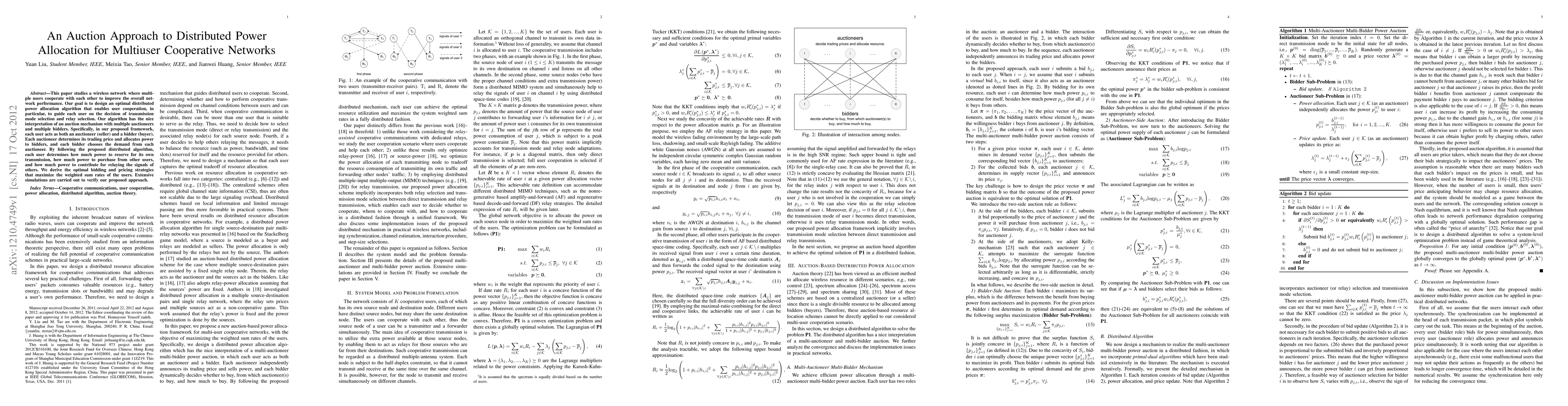 This paper studies a wireless network where multiple users cooperate with each other to improve the overall network performance. Our goal is to design an optimal distributed power allocation algorithm that enables user cooperation, in particular, to guide each user on the decision of transmission mode selection and relay selection. Our algorithm has the nice interpretation of an auction mechanism with multiple auctioneers and multiple bidders. Specifically, in our proposed framework, each user acts as both an auctioneer (seller) and a bidder (buyer). Each auctioneer determines its trading price and allocates power to bidders, and each bidder chooses the demand from each auctioneer. By following the proposed distributed algorithm, each user determines how much power to reserve for its own transmission, how much power to purchase from other users, and how much power to contribute for relaying the signals of others. We derive the optimal bidding and pricing strategies that maximize the weighted sum rates of the users. Extensive simulations are carried out to verify our proposed approach.