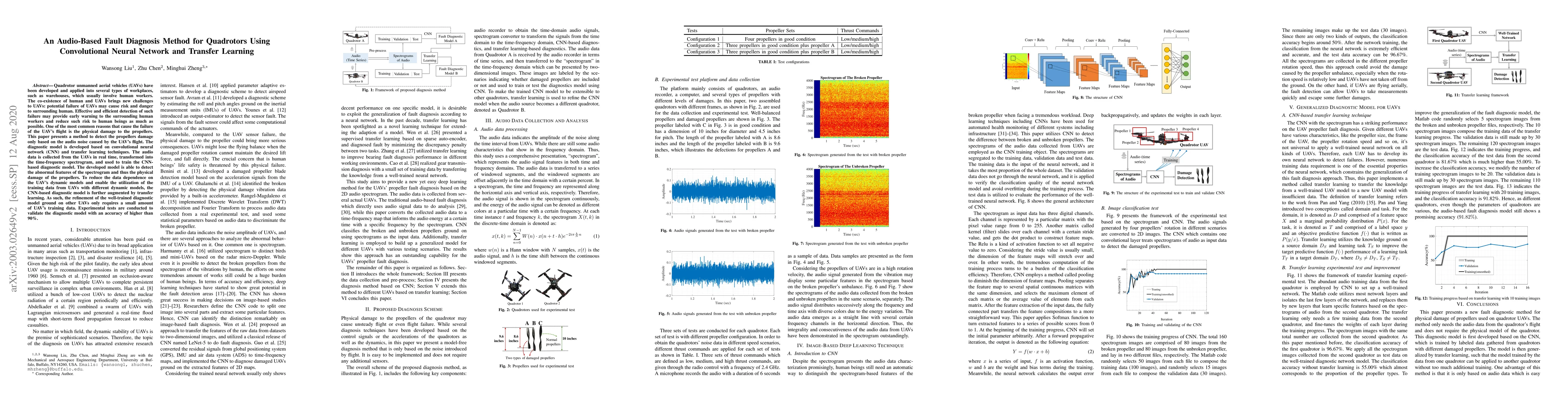 A new method detects propeller damage in quadrotors using audio noise from their flight, achieving accuracy over 90% with a neural network model that uses transfer learning.