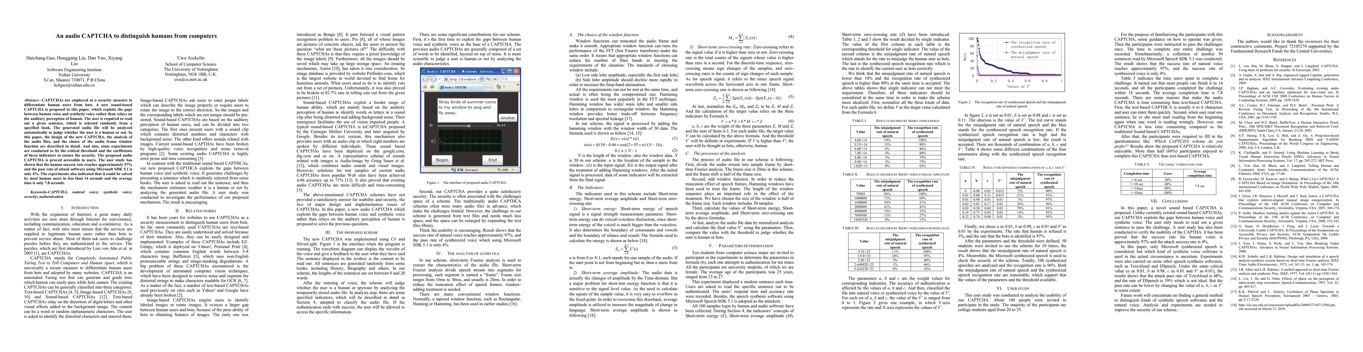 CAPTCHAs are employed as a security measure to differentiate human users from bots. A new sound-based CAPTCHA is proposed in this paper, which exploits the gaps between human voice and synthetic voice rather than relays on the auditory perception of human. The user is required to read out a given sentence, which is selected randomly from a specified book. The generated audio file will be analyzed automatically to judge whether the user is a human or not. In this paper, the design of the new CAPTCHA, the analysis of the audio files, and the choice of the audio frame window function are described in detail. And also, some experiments are conducted to fix the critical threshold and the coefficients of three indicators to ensure the security. The proposed audio CAPTCHA is proved accessible to users. The user study has shown that the human success rate reaches approximately 97% and the pass rate of attack software using Microsoft SDK 5.1 is only 4%. The experiments also indicated that it could be solved by most human users in less than 14 seconds and the average time is only 7.8 seconds.