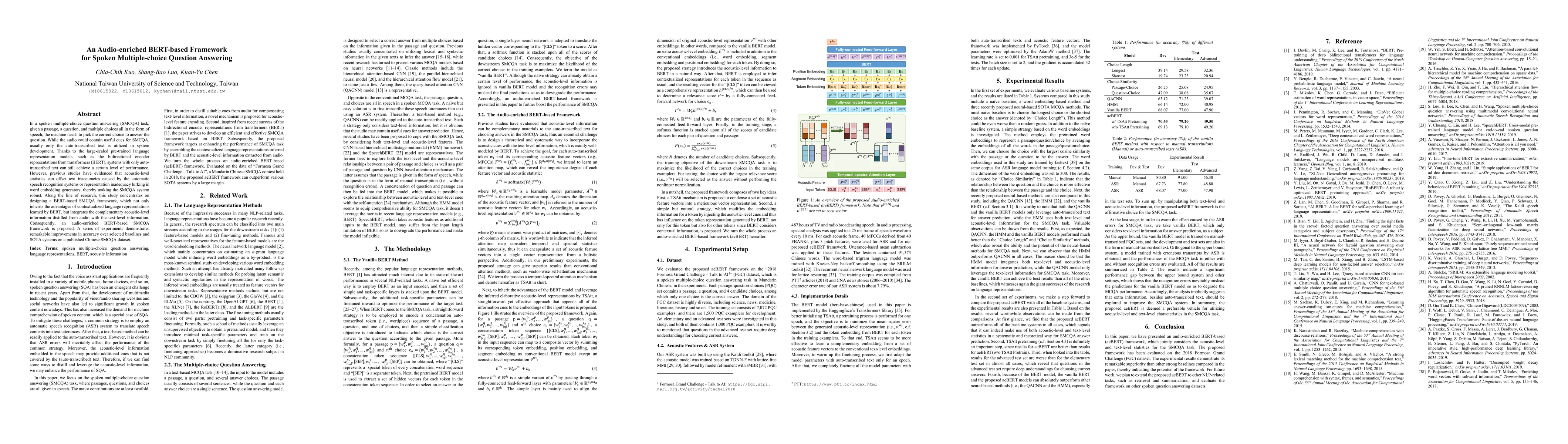 This paper proposes an audio-enriched BERT-based framework for spoken multiple-choice question answering, integrating acoustic-level audio information with BERT's contextualized text representations to improve accuracy over baselines on a Chinese dataset.