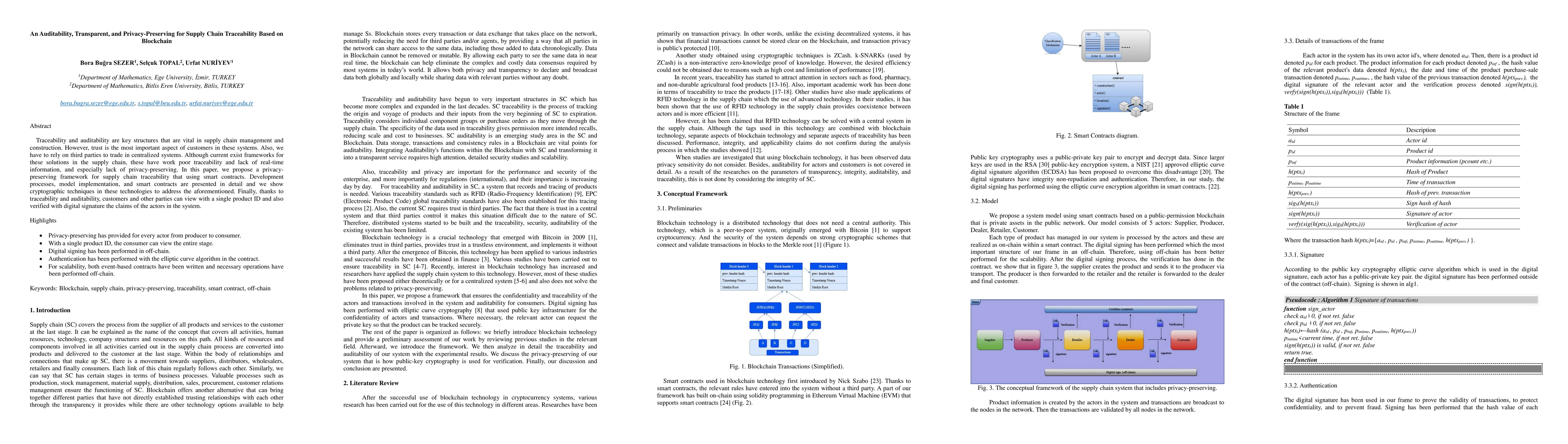 Traceability and auditability are key structures that are vital in supply chain management and construction. However, trust is the most important aspect of customers in these systems. Also, we have to rely on third parties to trade in centralized systems. Although current exist frameworks for these solutions in the supply chain, these have work poor traceability and lack of real-time information, and especially lack of privacy-preserving. In this paper, we propose a privacy-preserving framework for supply chain traceability that using smart contracts. Development processes, model implementation, and smart contracts are presented in detail and we show cryptographic techniques in these technologies to address the aforementioned. Finally, thanks to traceability and auditability, customers and other parties can view with a single product ID and also verified with digital signature the claims of the actors in the system.