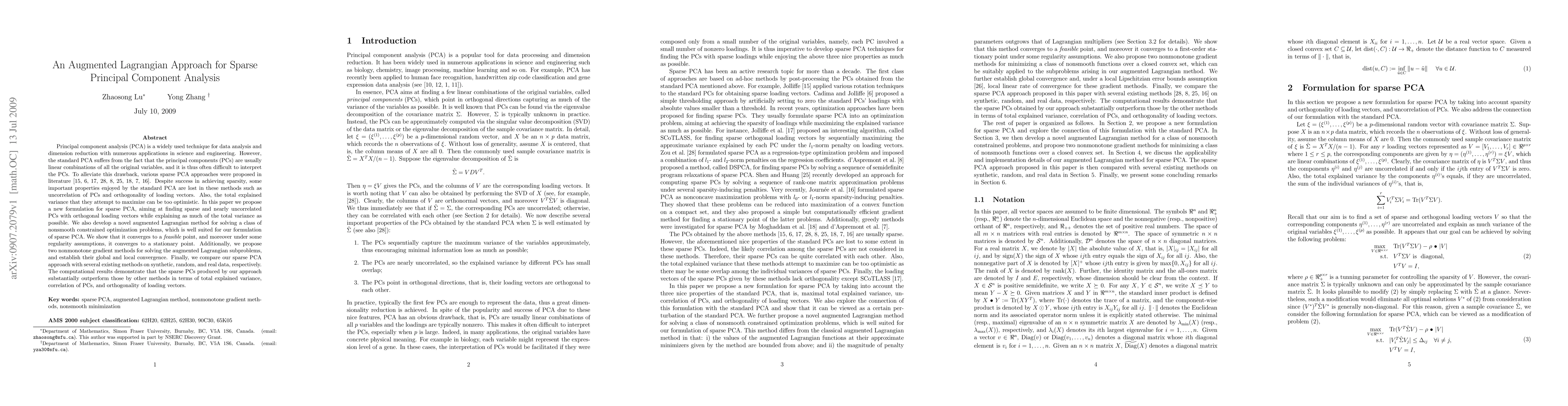 This paper proposes a new sparse PCA method that aims to find sparse, nearly uncorrelated principal components with orthogonal loading vectors while maximizing explained variance. It introduces an augmented Lagrangian approach for solving the optimization problem and demonstrates its convergence properties. The proposed method outperforms existing techniques in terms of explained variance, correlation, and orthogonality, as shown through comparisons on various datasets.