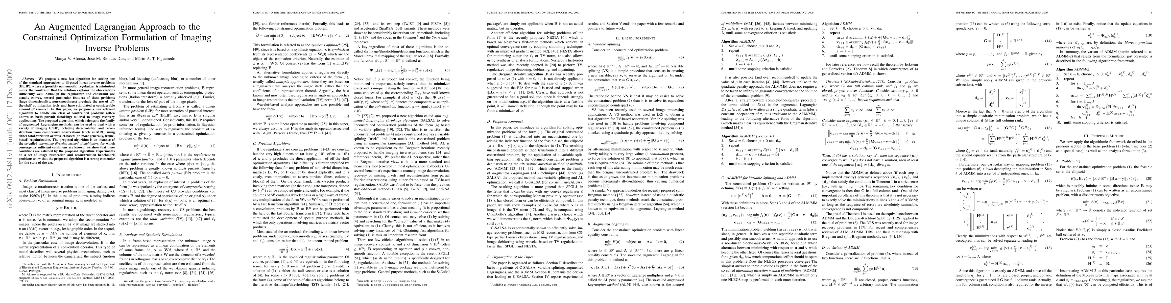 We propose a new fast algorithm for solving one of the standard approaches to ill-posed linear inverse problems (IPLIP), where a (possibly non-smooth) regularizer is minimized under the constraint that the solution explains the observations sufficiently well. Although the regularizer and constraint are usually convex, several particular features of these problems (huge dimensionality, non-smoothness) preclude the use of off-the-shelf optimization tools and have stimulated a considerable amount of research. In this paper, we propose a new efficient algorithm to handle one class of constrained problems (often known as basis pursuit denoising) tailored to image recovery applications. The proposed algorithm, which belongs to the family of augmented Lagrangian methods, can be used to deal with a variety of imaging IPLIP, including deconvolution and reconstruction from compressive observations (such as MRI), using either total-variation or wavelet-based (or, more generally, frame-based) regularization. The proposed algorithm is an instance of the so-called "alternating direction method of multipliers", for which convergence sufficient conditions are known; we show that these conditions are satisfied by the proposed algorithm. Experiments on a set of image restoration and reconstruction benchmark problems show that the proposed algorithm is a strong contender for the state-of-the-art.