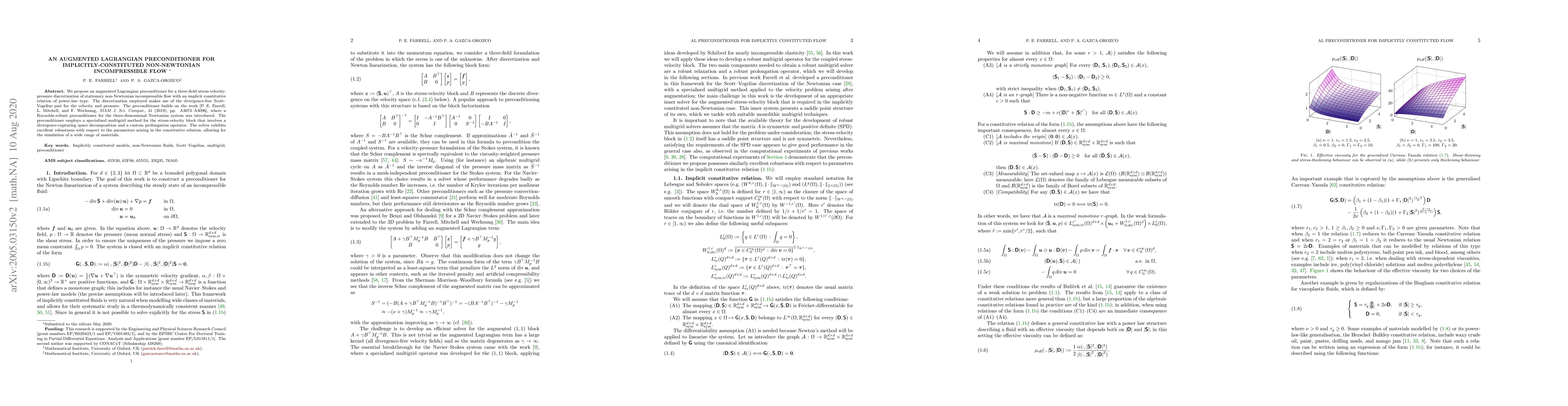 This paper proposes an augmented Lagrangian preconditioner for solving non-Newtonian incompressible flow using a three-field discretization. The method employs a specialized multigrid approach for robustness across various material parameters, enabling efficient simulation of a wide range of materials with power-law constitutive relations.