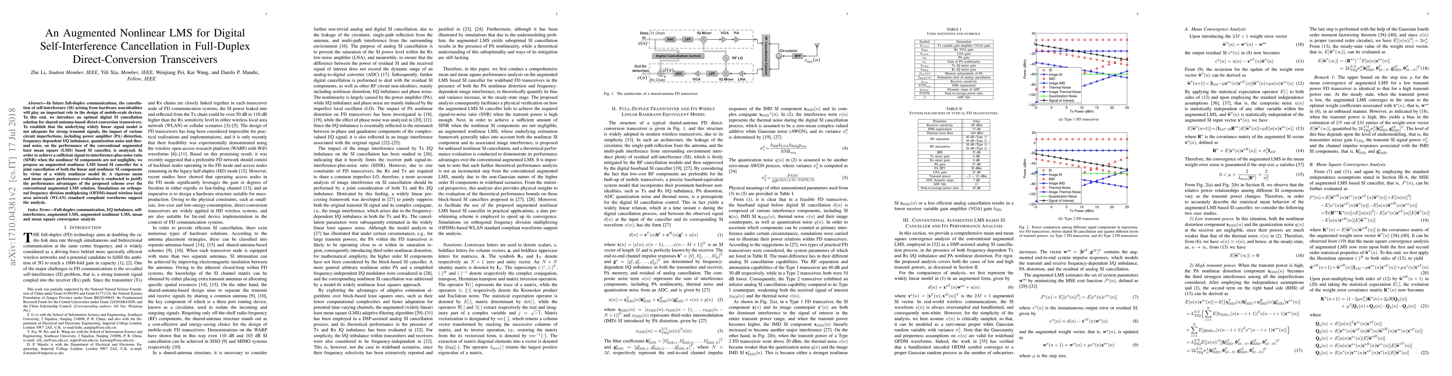 In future full-duplex communications, the cancellation of self-interference (SI) arising from hardware non-idealities will play an important role in the design of mobile-scale devices. To this end, we introduce an optimal digital SI cancellation solution for shared-antenna-based direct-conversion transceivers. To establish that the underlying widely linear signal model is not adequate for strong transmit signals, the impact of various circuit imperfections, including power amplifier (PA) distortion, frequency-dependent I/Q imbalance, quantization noise and thermal noise, on the performance of the conventional augmented least mean square (LMS) based SI canceller, is analyzed. In order to achieve a sufficient signal-to-interference-plus-noise ratio (SINR) when the nonlinear SI components are not negligible, we propose an augmented nonlinear LMS based SI canceller for a joint cancellation of both the linear and nonlinear SI components by virtue of a widely nonlinear model fit. A rigorous mean and mean square performance evaluation is conducted to justify the performance advantages of the proposed scheme over the conventional augmented LMS solution. Simulations on orthogonal frequency division multiplexing (OFDM)-based wireless local area network (WLAN) standard compliant waveforms support the analysis.