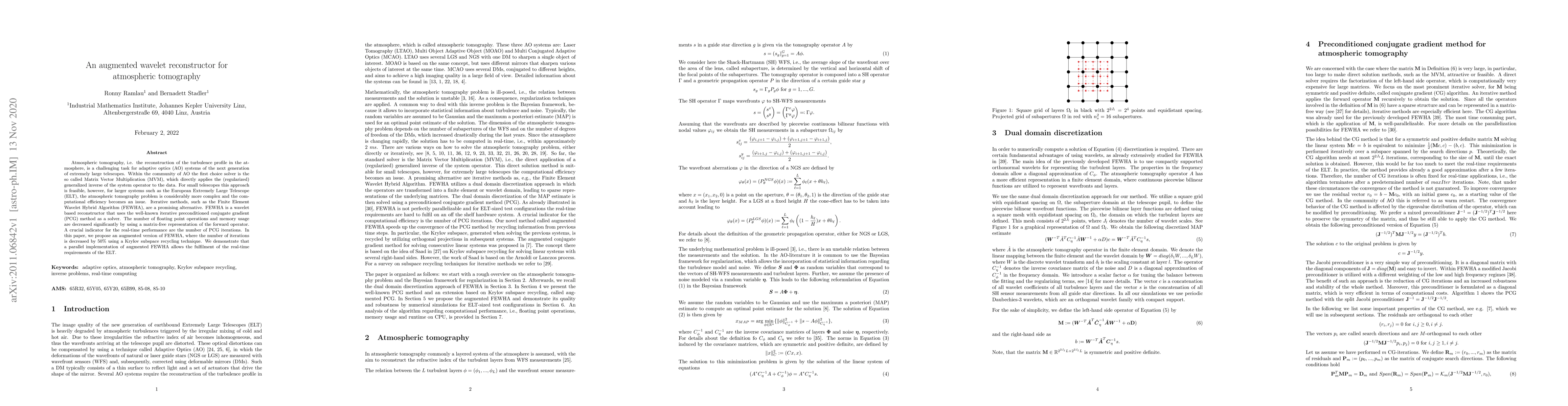 Atmospheric tomography, i.e. the reconstruction of the turbulence profile in the atmosphere, is a challenging task for adaptive optics (AO) systems of the next generation of extremely large telescopes. Within the community of AO the first choice solver is the so called Matrix Vector Multiplication (MVM), which directly applies the (regularized) generalized inverse of the system operator to the data. For small telescopes this approach is feasible, however, for larger systems such as the European Extremely Large Telescope (ELT), the atmospheric tomography problem is considerably more complex and the computational efficiency becomes an issue. Iterative methods, such as the Finite Element Wavelet Hybrid Algorithm (FEWHA), are a promising alternative. FEWHA is a wavelet based reconstructor that uses the well-known iterative preconditioned conjugate gradient (PCG) method as a solver. The number of floating point operations and memory usage are decreased significantly by using a matrix-free representation of the forward operator. A crucial indicator for the real-time performance are the number of PCG iterations. In this paper, we propose an augmented version of FEWHA, where the number of iterations is decreased by $50\%$ using a Krylov subspace recycling technique. We demonstrate that a parallel implementation of augmented FEWHA allows the fulfilment of the real-time requirements of the ELT.