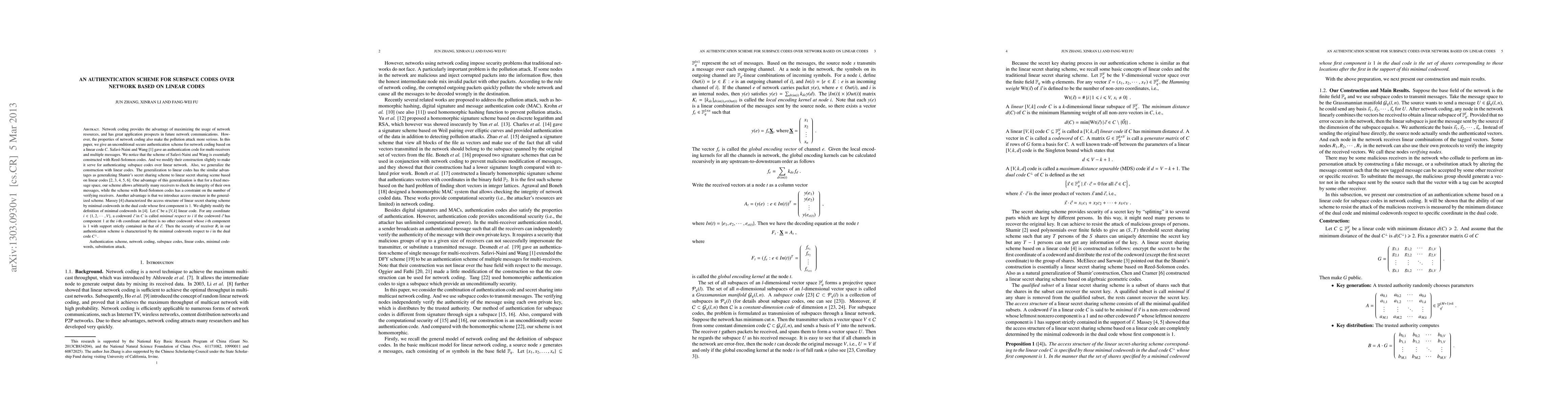 Researchers develop an authentication scheme for subspace codes over networks that provides unconditional security against pollution attacks, allowing multiple receivers to verify message integrity with arbitrary flexibility.