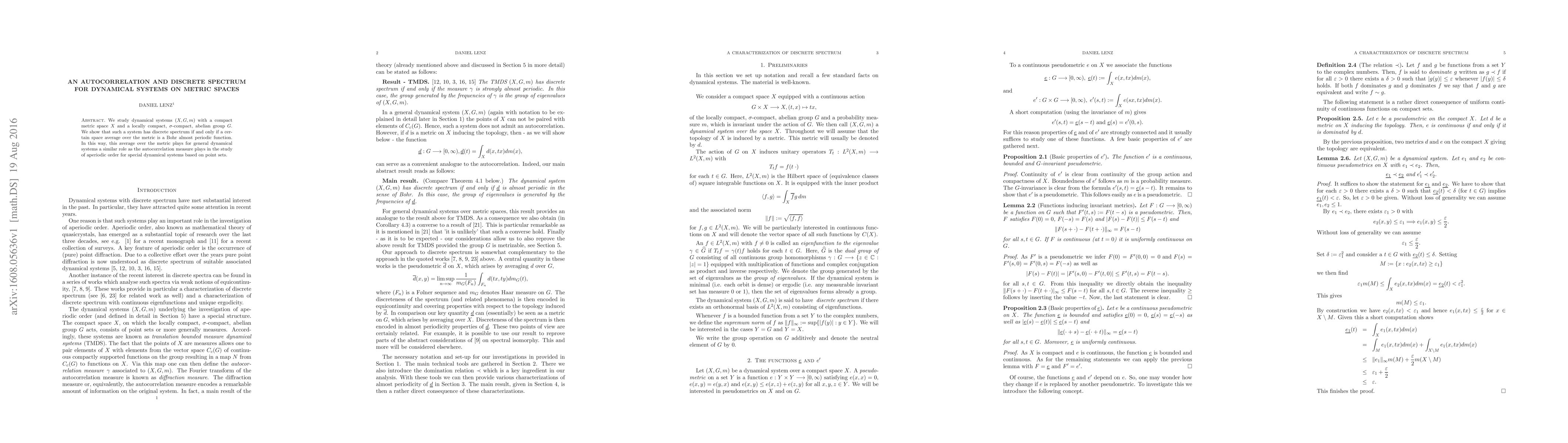 This paper investigates dynamical systems on compact metric spaces, proving that such systems have a discrete spectrum if and only if a metric space average is a Bohr almost periodic function, analogous to the role of autocorrelation in special dynamical systems.