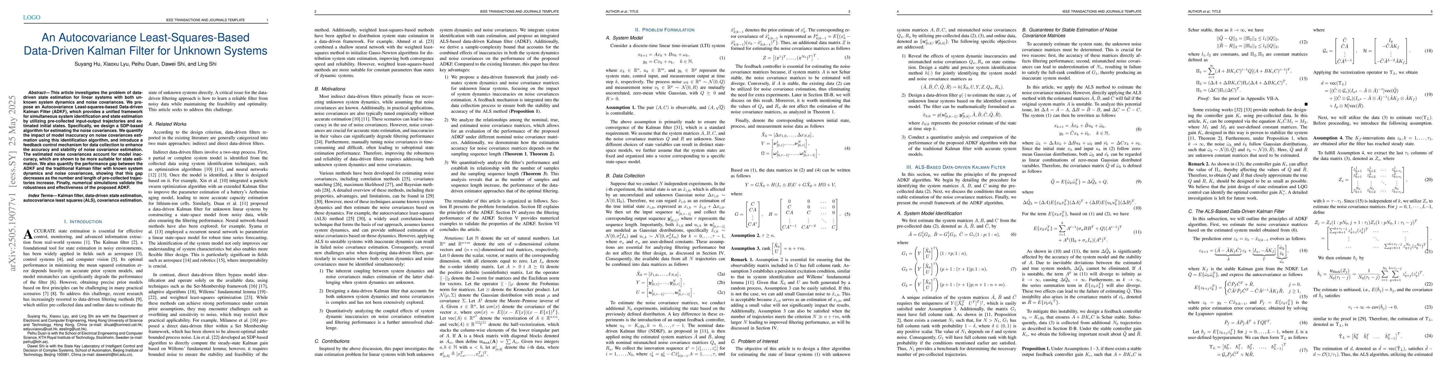The paper presents an Autocovariance Least-squares-based Data-driven Kalman Filter (ADKF) that integrates system identification and state estimation, utilizing a SDP-algorithm for noise covariance estimation and a feedback control mechanism for data collection.