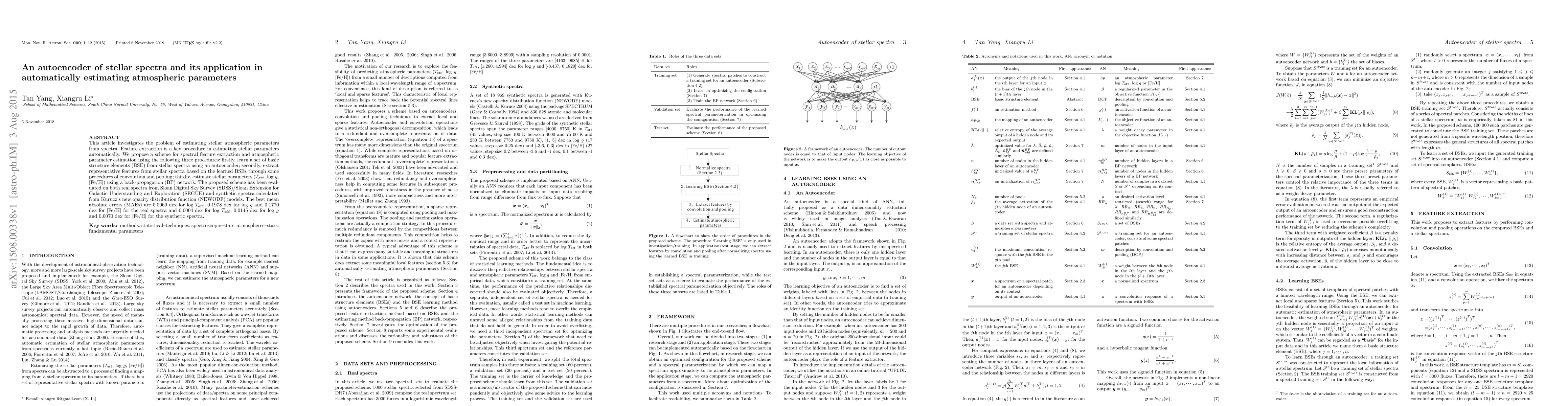 This paper proposes an autoencoder-based scheme for extracting spectral features and estimating stellar atmospheric parameters, achieving high accuracy with mean absolute errors of 0.0060 dex for log~$T_{eff}$, 0.1978 dex for log~$g$, and 0.1770 dex for [Fe/H] on real spectra and significantly lower errors on synthetic spectra.
