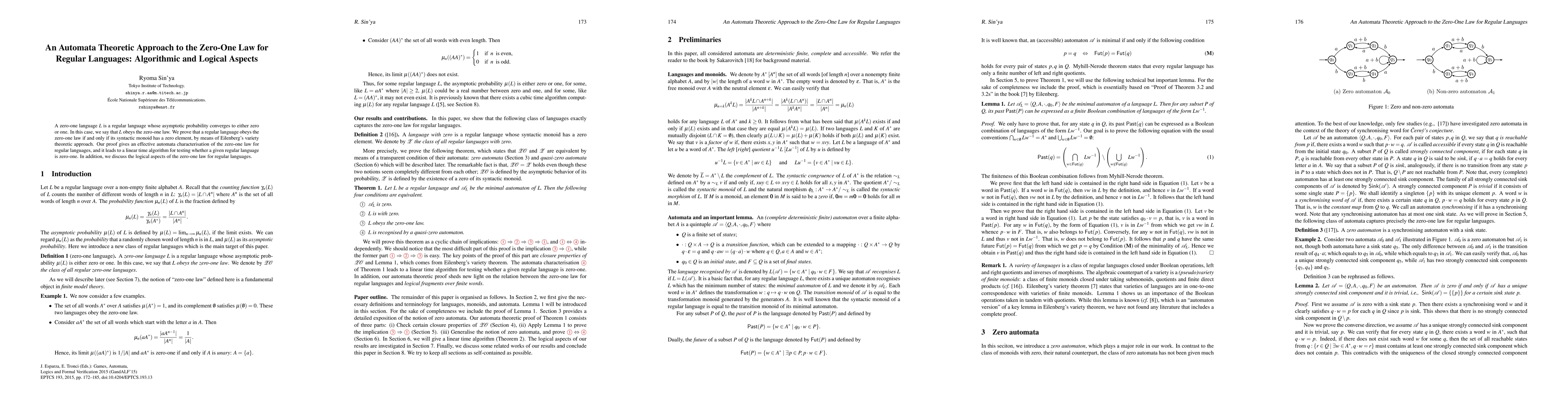 A zero-one language L is a regular language whose asymptotic probability converges to either zero or one. In this case, we say that L obeys the zero-one law. We prove that a regular language obeys the zero-one law if and only if its syntactic monoid has a zero element, by means of Eilenberg's variety theoretic approach. Our proof gives an effective automata characterisation of the zero-one law for regular languages, and it leads to a linear time algorithm for testing whether a given regular language is zero-one. In addition, we discuss the logical aspects of the zero-one law for regular languages.