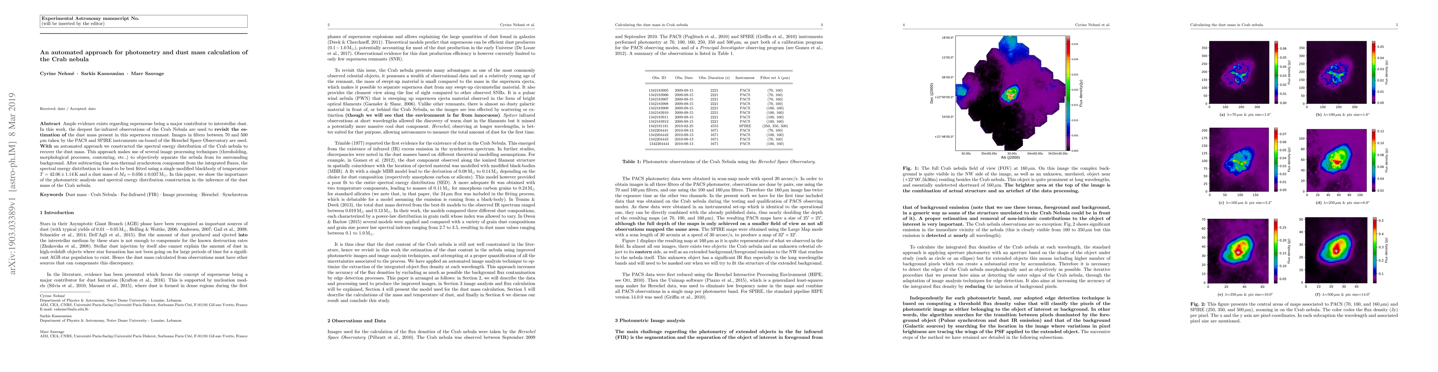 Ample evidence exists regarding supernovae being a major contributor to interstellar dust. In this work, the deepest far-infrared observations of the Crab Nebula are used to revisit the estimation of} the dust mass present in this supernova remnant. Images in filters between 70 and 500 $\mu$m taken by the PACS and SPIRE instruments on-board of the Herschel Space Observatory are used. With an automated approach we constructed the spectral energy distribution of the Crab nebula to recover the dust mass. This approach makes use of several image processing techniques (thresholding, morphological processes, contouring, etc..) to objectively separate the nebula from its surrounding background. After subtracting the non-thermal synchrotron component from the integrated fluxes, the spectral energy distribution is found to be best fitted using a single modified blackbody of temperature $T=42.06\pm1.14$ K and a dust mass of $M_{d}=0.056\pm0.037$ M$_{\odot}$. In this paper, we show the importance of the photometric analysis and spectral energy distribution construction in the inference of the dust mass of the Crab nebula.