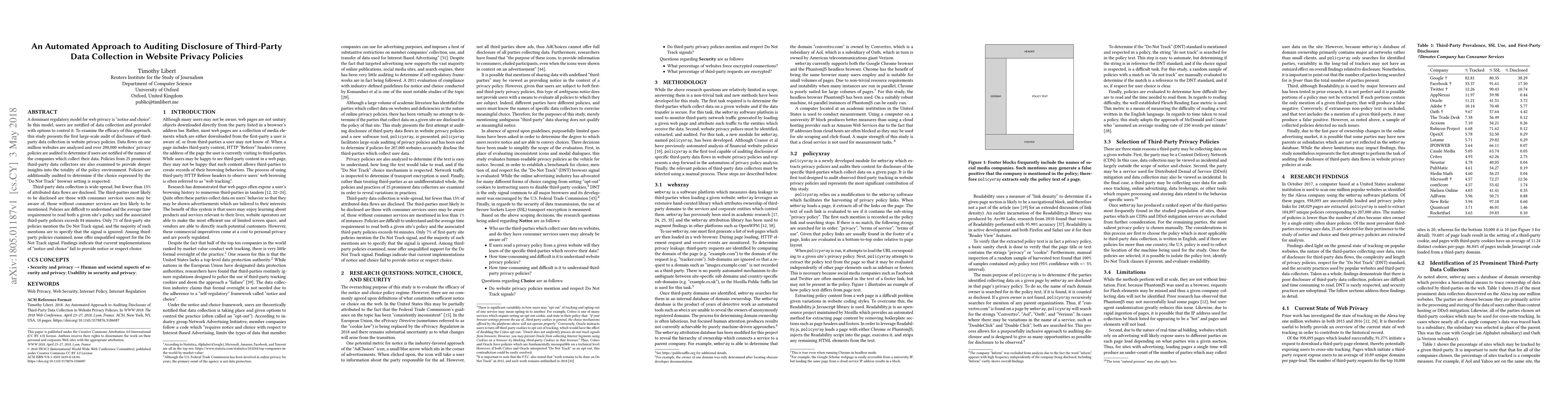 This study conducts a large-scale audit of third-party data collection disclosures in website privacy policies, revealing that less than 15% of data flows are disclosed and only 7% of first-party policies mention the "Do Not Track" signal, often to ignore it. The findings suggest that current "notice and choice" models are ineffective in informing users or respecting their choices.