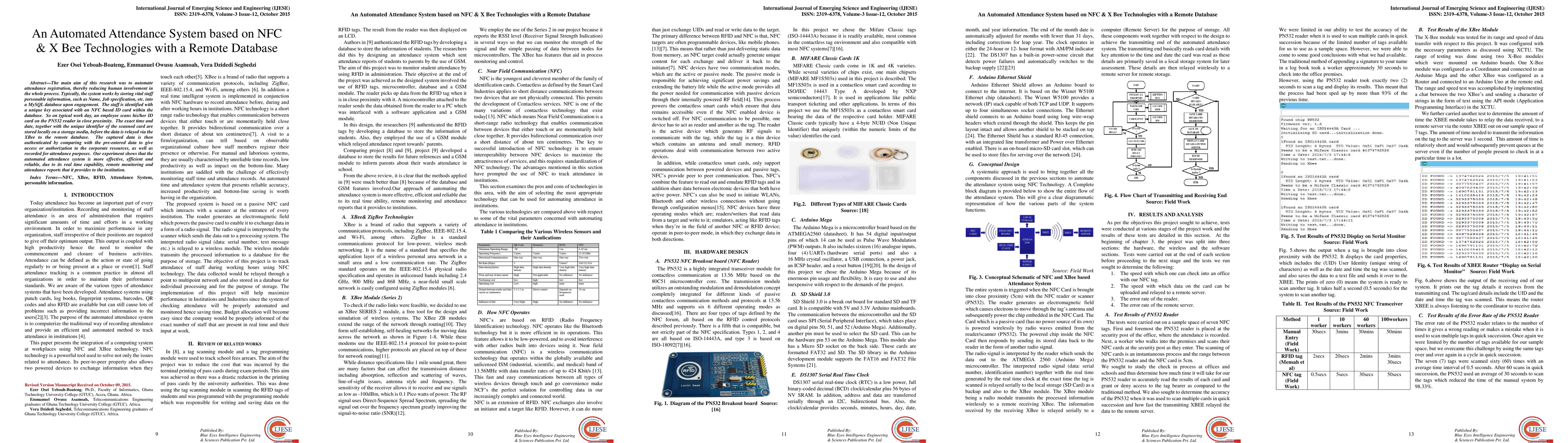 This research develops an automated attendance system using NFC and XBee technologies linked to a remote MySQL database, aiming to minimize human involvement. It captures and relays employee attendance data in real time, enhancing efficiency and reliability through remote monitoring and automated reports.