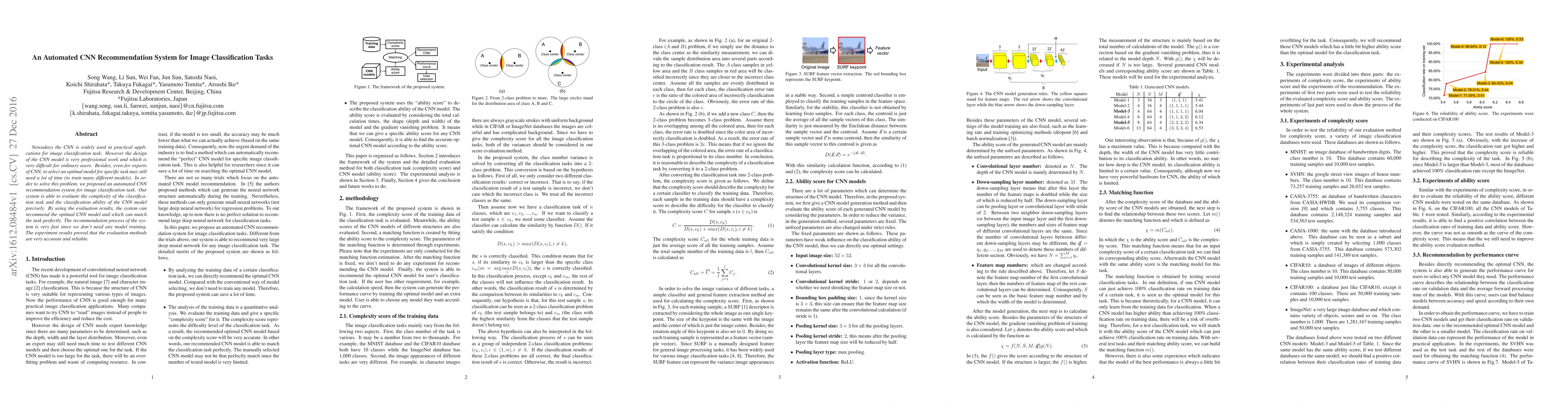 Nowadays the CNN is widely used in practical applications for image classification task. However the design of the CNN model is very professional work and which is very difficult for ordinary users. Besides, even for experts of CNN, to select an optimal model for specific task may still need a lot of time (to train many different models). In order to solve this problem, we proposed an automated CNN recommendation system for image classification task. Our system is able to evaluate the complexity of the classification task and the classification ability of the CNN model precisely. By using the evaluation results, the system can recommend the optimal CNN model and which can match the task perfectly. The recommendation process of the system is very fast since we don't need any model training. The experiment results proved that the evaluation methods are very accurate and reliable.
