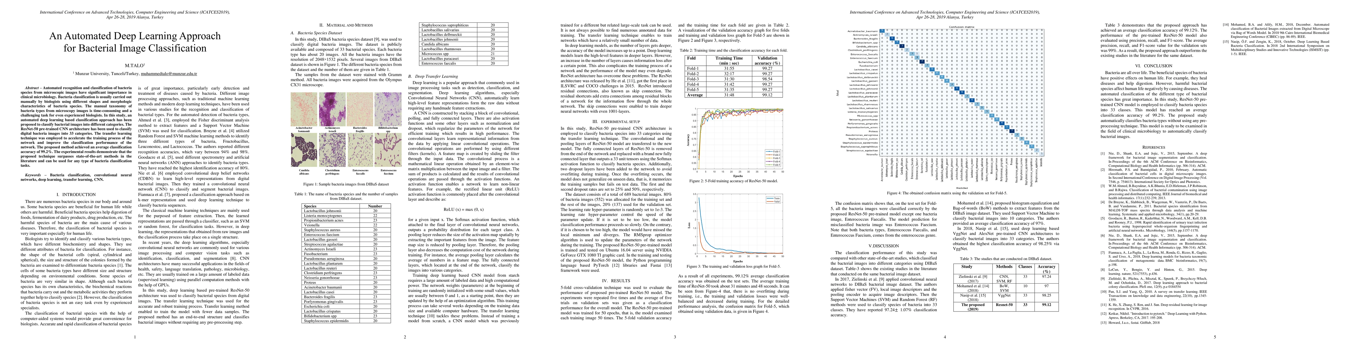 This paper proposes an automated deep learning approach using a ResNet-50 pre-trained CNN for classifying bacterial images into 33 categories, employing transfer learning to achieve 99.2% accuracy, outperforming existing methods and offering a time-efficient alternative to manual bacterial classification.