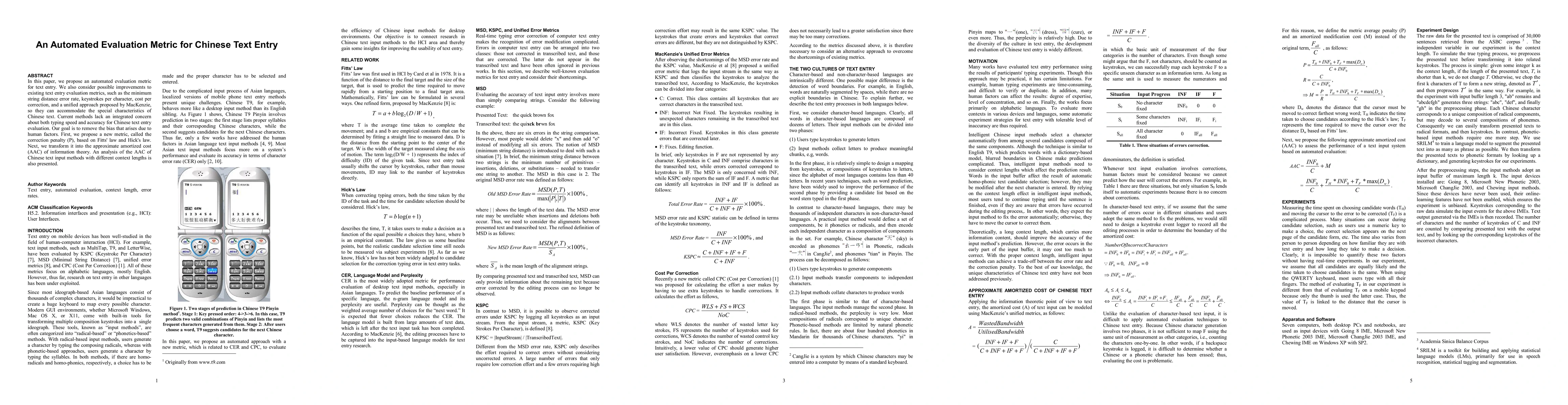 In this paper, we propose an automated evaluation metric for text entry. We also consider possible improvements to existing text entry evaluation metrics, such as the minimum string distance error rate, keystrokes per character, cost per correction, and a unified approach proposed by MacKenzie, so they can accommodate the special characteristics of Chinese text. Current methods lack an integrated concern about both typing speed and accuracy for Chinese text entry evaluation. Our goal is to remove the bias that arises due to human factors. First, we propose a new metric, called the correction penalty (P), based on Fitts' law and Hick's law. Next, we transform it into the approximate amortized cost (AAC) of information theory. An analysis of the AAC of Chinese text input methods with different context lengths is also presented.