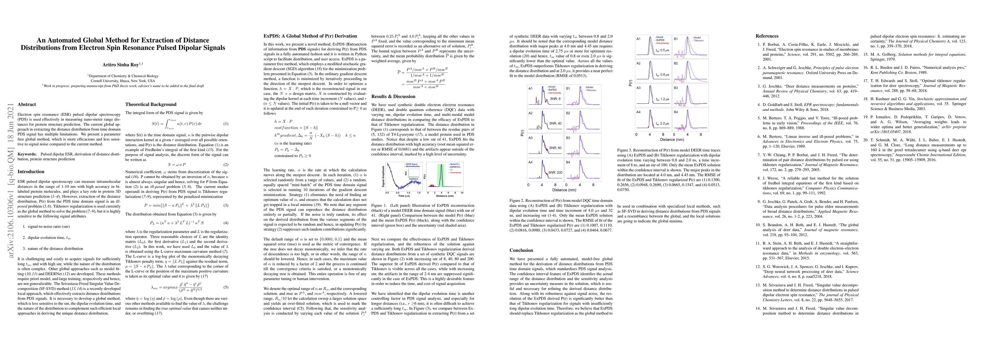 Electron spin resonance (ESR) pulsed dipolar spectroscopy (PDS) is used effectively in measuring nano-meter range distances for protein structure prediction. The current global approach in extracting the distance distribution from time domain PDS signal has multiple limitations. We present a parameter free global method, which is more efficacious and less sensitive to signal noise compared to the current method.