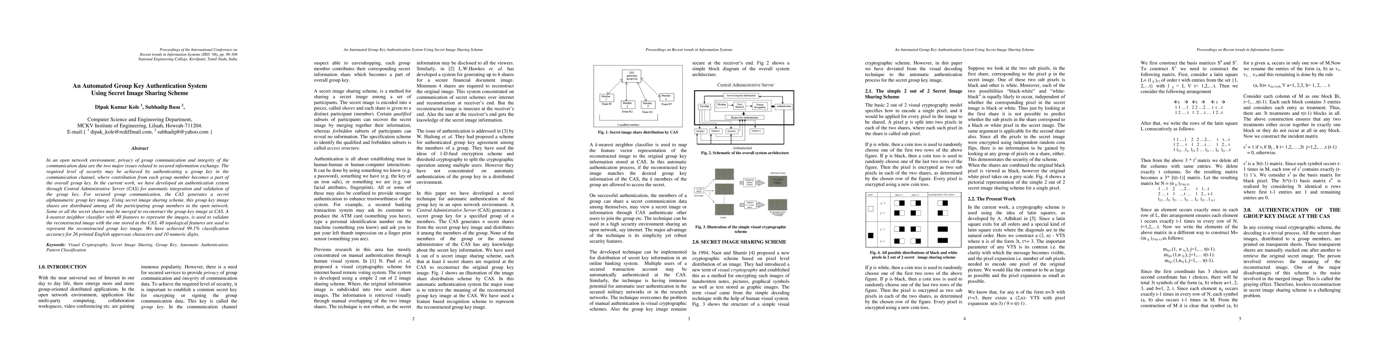 In an open network environment, privacy of group communication and integrity of the communication data are the two major issues related to secured information exchange. The required level of security may be achieved by authenticating a group key in the communication channel, where contribution from each group member becomes a part of the overall group key. In the current work, we have developed an authentication system through Central Administrative Server (CAS) for automatic integration and validation of the group key. For secured group communication, the CAS generates a secret alphanumeric group key image. Using secret image sharing scheme, this group key image shares are distributed among all the participating group members in the open network. Some or all the secret shares may be merged to reconstruct the group key image at CAS. A k-nearest neighbor classifier with 48 features to represent the images, is used to validate the reconstructed image with the one stored in the CAS. 48 topological features are used to represent the reconstructed group key image. We have achieved 99.1% classification accuracy for 26 printed English uppercase characters and 10 numeric digits.