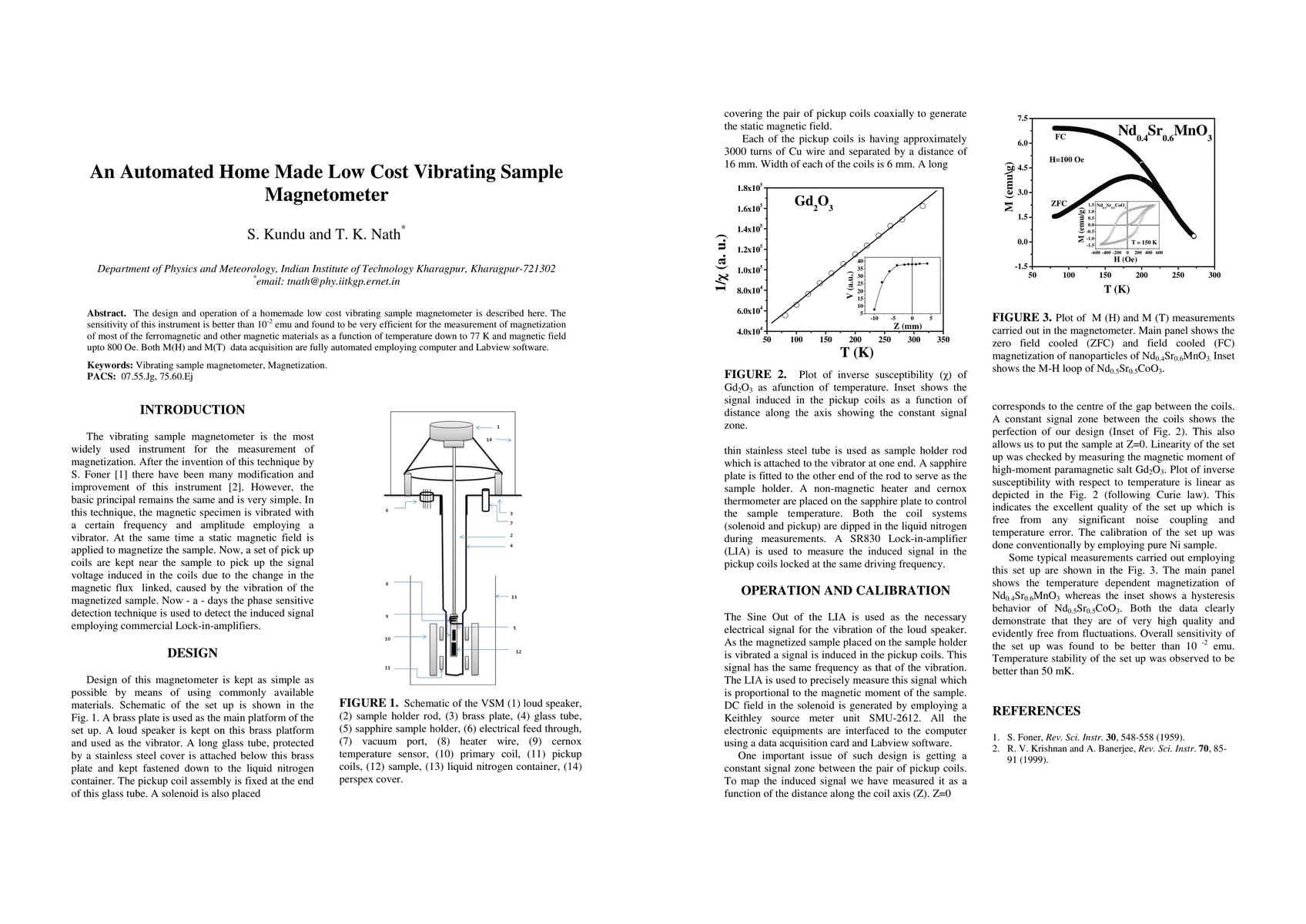 The design and operation of a homemade low cost vibrating sample magnetometer is described here. The sensitivity of this instrument is better than 10-2 emu and found to be very efficient for the measurement of magnetization of most of the ferromagnetic and other magnetic materials as a function of temperature down to 77 K and magnetic field upto 800 Oe. Both M(H) and M(T) data acquisition are fully automated employing computer and Labview software