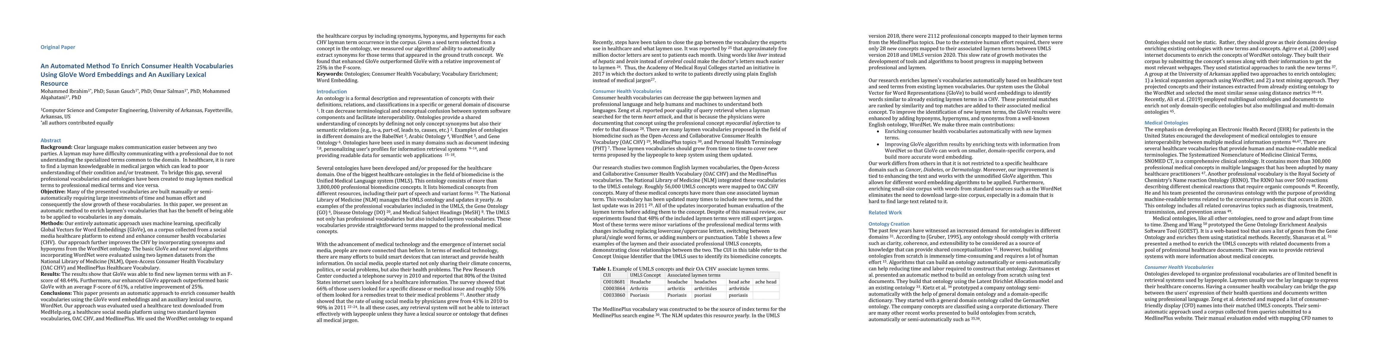 This paper presents an automated method using GloVe word embeddings and WordNet to enrich consumer health vocabularies, achieving an average F-score improvement of 25% over basic GloVe, demonstrating significant statistical significance in extending laymen's healthcare vocabulary.