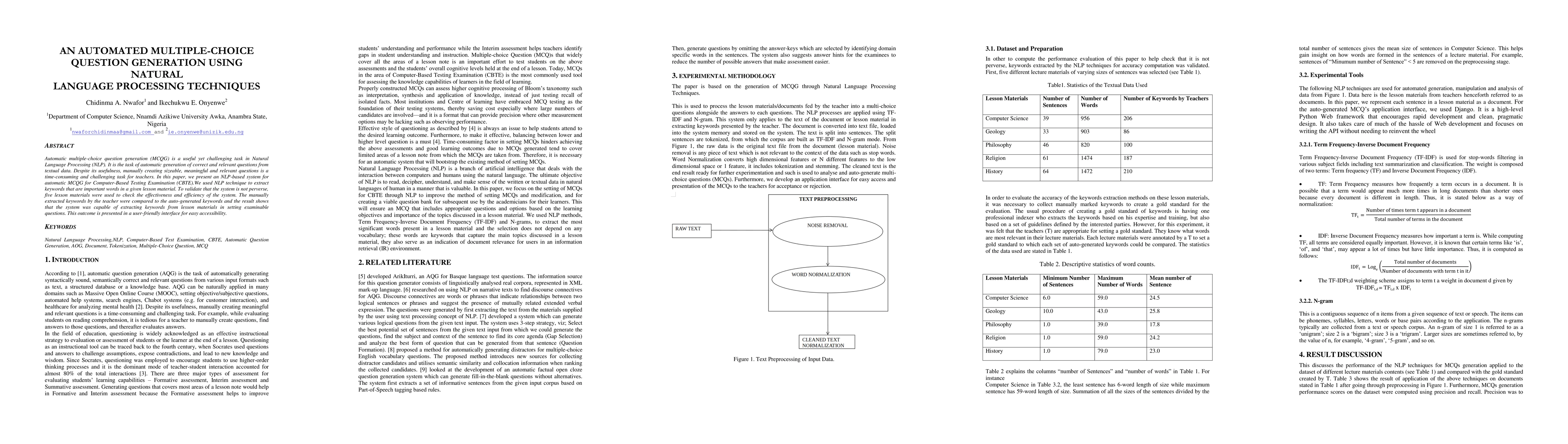This paper presents an NLP-based system for automatic generation of multiple-choice questions from textual data, aiming to assist teachers in creating relevant questions for Computer-Based Testing Examinations. The system uses NLP techniques to extract important keywords and was validated using five lesson materials, demonstrating its effectiveness in generating examinable questions.