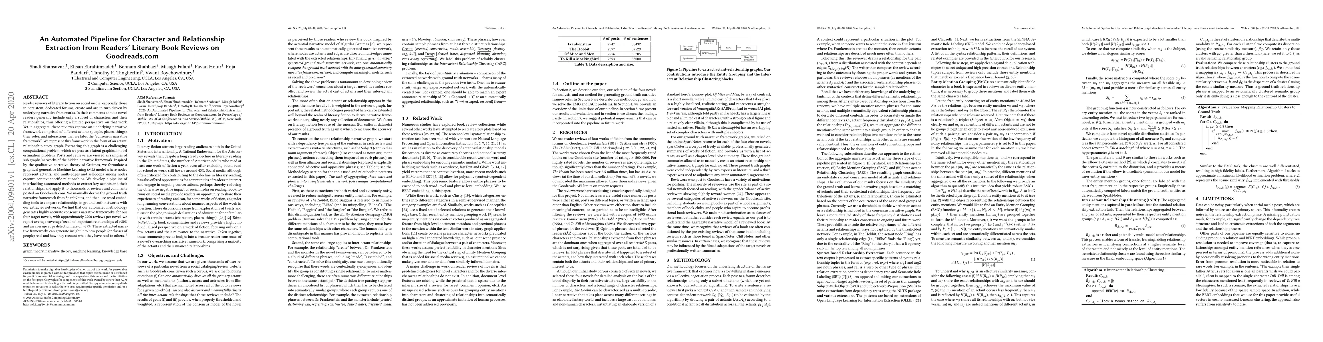 Researchers developed an automated pipeline to extract character and relationship information from book reviews on Goodreads.com, achieving high accuracy rates of >80% coverage/recall and >89% edge detection rate for four target novels.