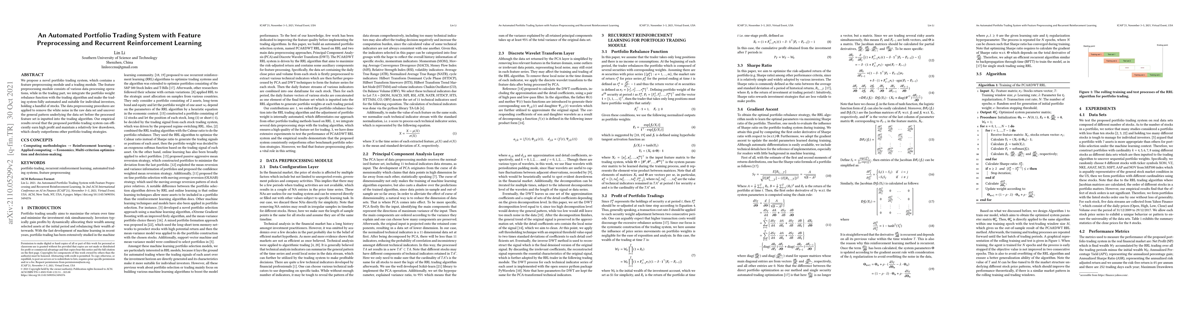 This paper introduces a fully automated portfolio trading system that employs feature preprocessing and recurrent reinforcement learning. The system effectively removes noise and uncovers data patterns, leading to high profitability and low drawdown compared to other strategies.