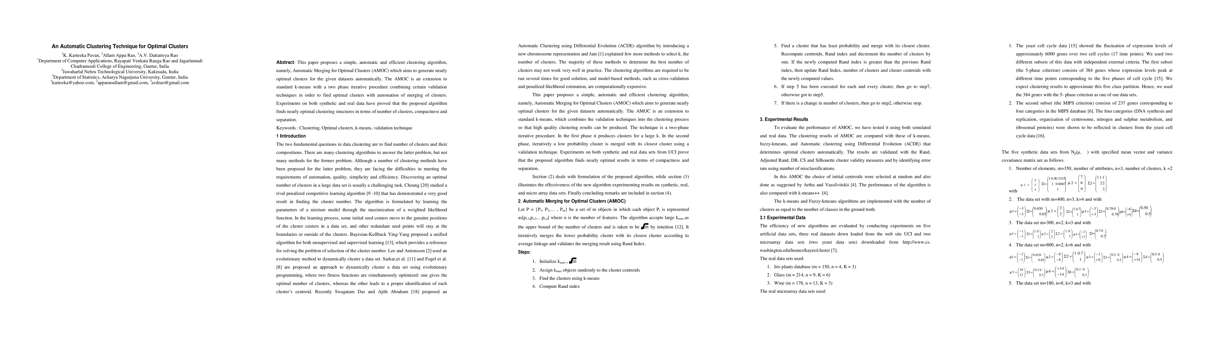 This paper proposes a simple, automatic and efficient clustering algorithm, namely, Automatic Merging for Optimal Clusters (AMOC) which aims to generate nearly optimal clusters for the given datasets automatically. The AMOC is an extension to standard k-means with a two phase iterative procedure combining certain validation techniques in order to find optimal clusters with automation of merging of clusters. Experiments on both synthetic and real data have proved that the proposed algorithm finds nearly optimal clustering structures in terms of number of clusters, compactness and separation.