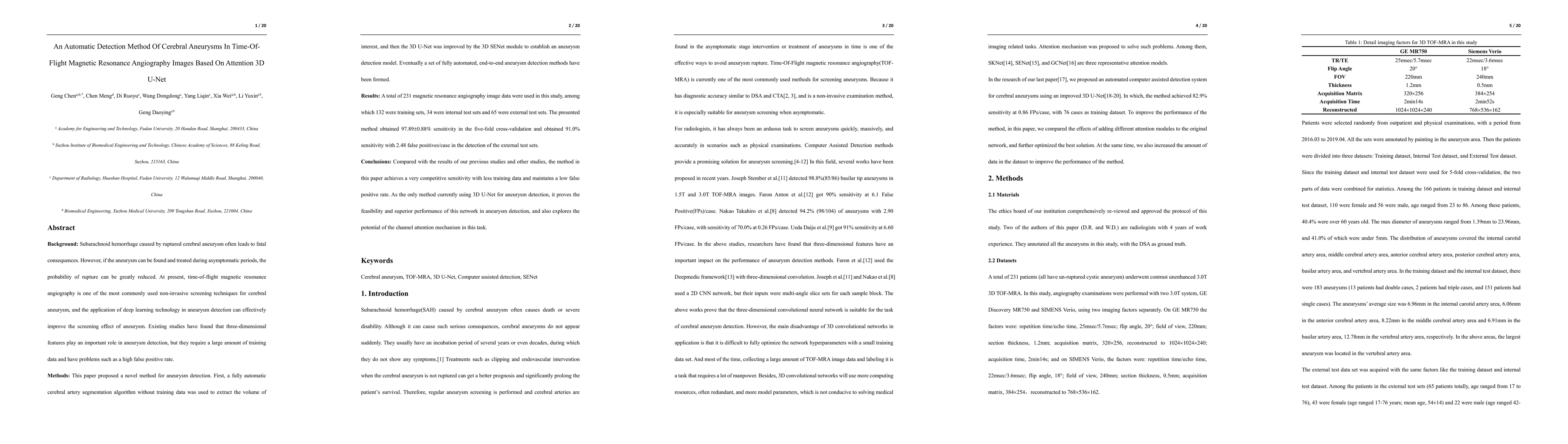 Background:Subarachnoid hemorrhage caused by ruptured cerebral aneurysm often leads to fatal consequences.However,if the aneurysm can be found and treated during asymptomatic periods,the probability of rupture can be greatly reduced.At present,time-of-flight magnetic resonance angiography is one of the most commonly used non-invasive screening techniques for cerebral aneurysm,and the application of deep learning technology in aneurysm detection can effectively improve the screening effect of aneurysm.Existing studies have found that three-dimensional features play an important role in aneurysm detection,but they require a large amount of training data and have problems such as a high false positive rate. Methods:This paper proposed a novel method for aneurysm detection.First,a fully automatic cerebral artery segmentation algorithm without training data was used to extract the volume of interest,and then the 3D U-Net was improved by the 3D SENet module to establish an aneurysm detection model.Eventually a set of fully automated,end-to-end aneurysm detection methods have been formed. Results:A total of 231 magnetic resonance angiography image data were used in this study,among which 132 were training sets,34 were internal test sets and 65 were external test sets.The presented method obtained 97.89% sensitivity in the five-fold cross-validation and obtained 91.0% sensitivity with 2.48 false positives/case in the detection of the external test sets. Conclusions:Compared with the results of our previous studies and other studies,the method in this paper achieves a very competitive sensitivity with less training data and maintains a low false positive rate.As the only method currently using 3D U-Net for aneurysm detection,it proves the feasibility and superior performance of this network in aneurysm detection,and also explores the potential of the channel attention mechanism in this task.